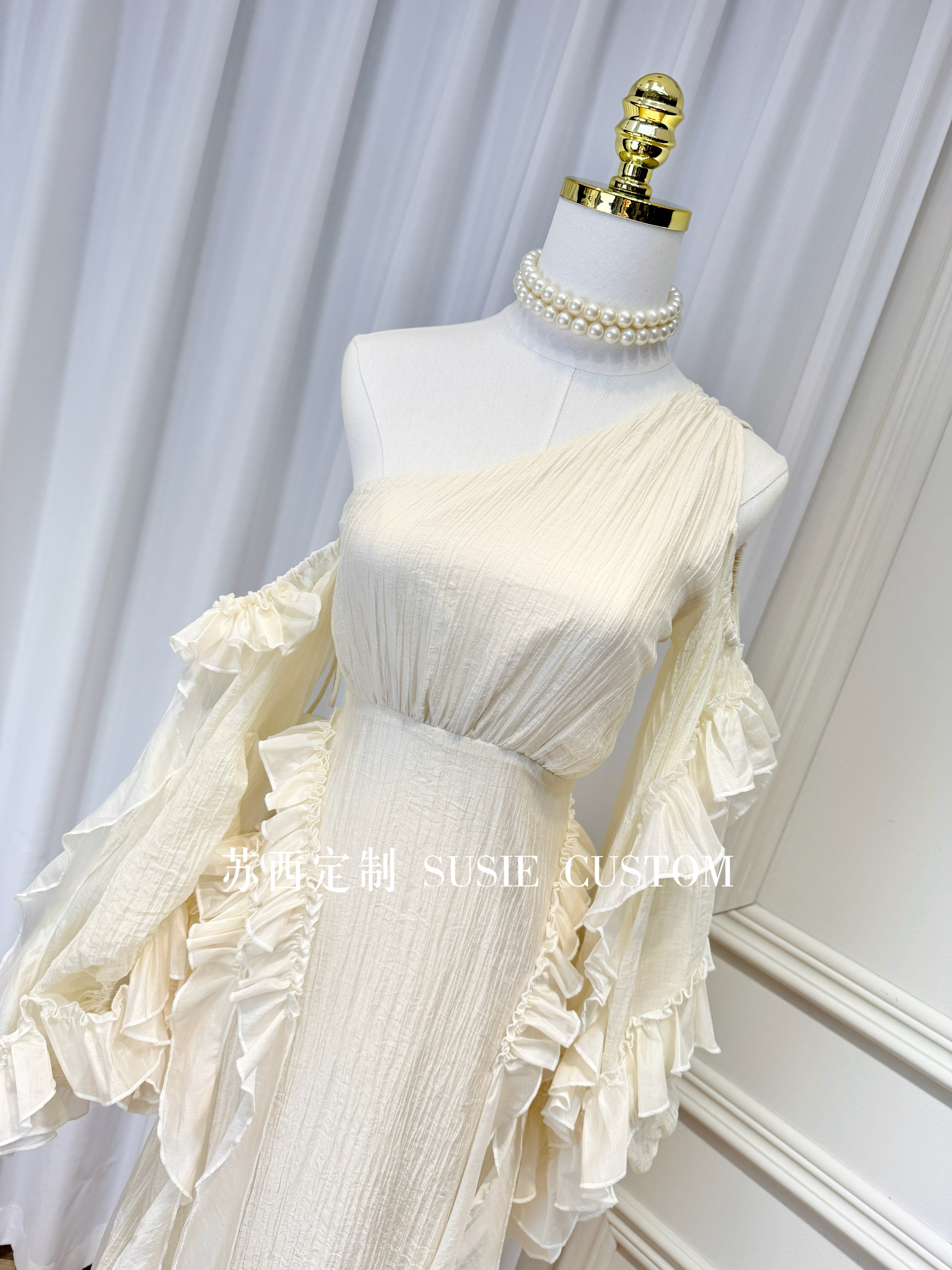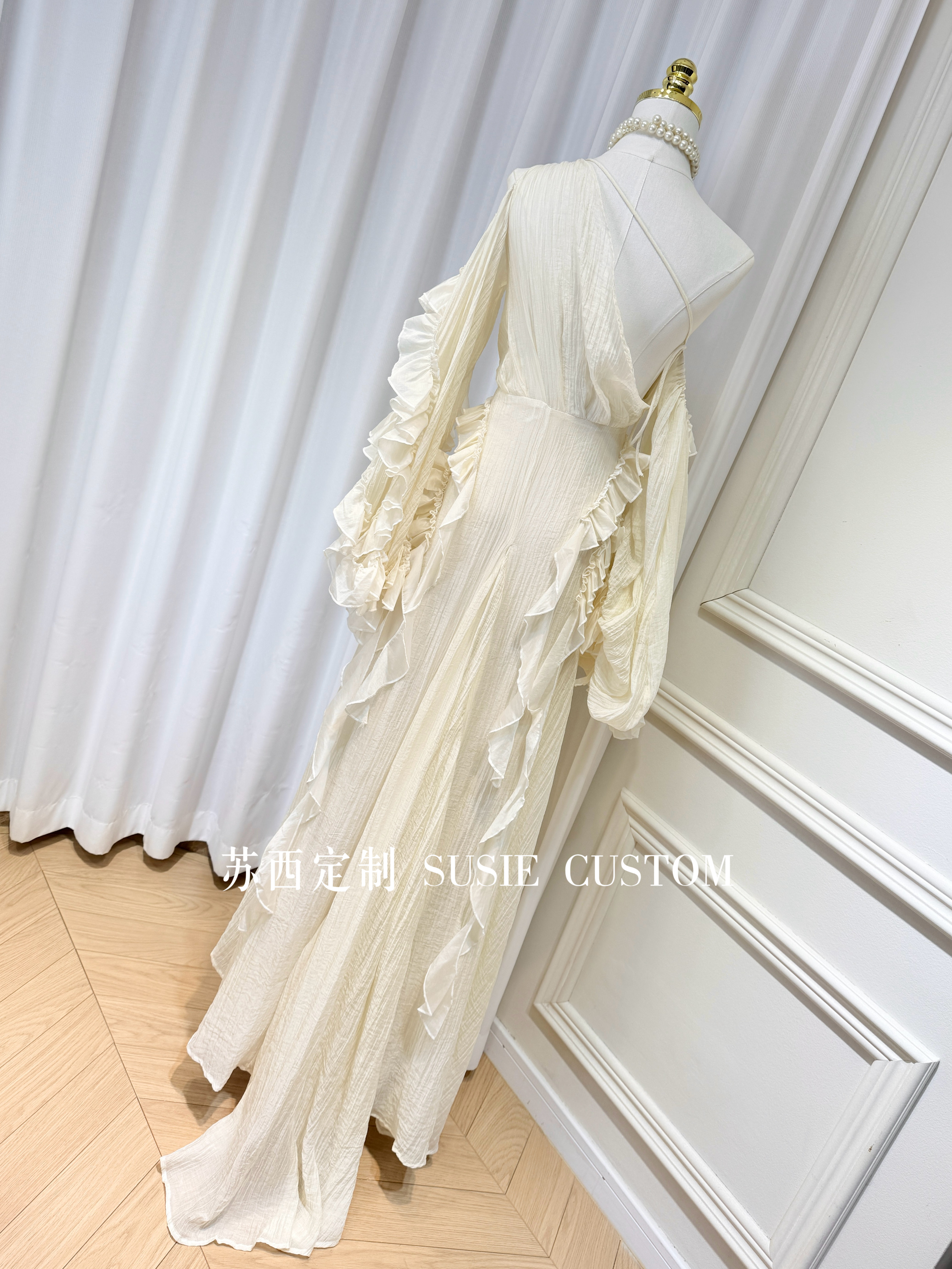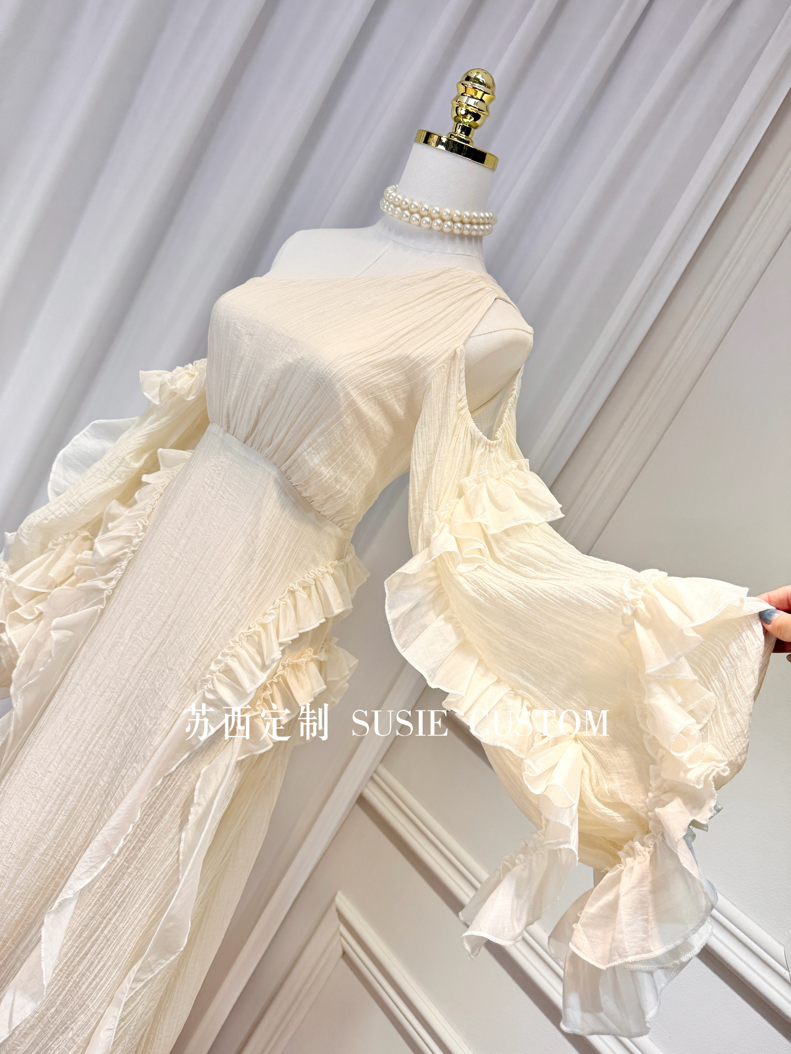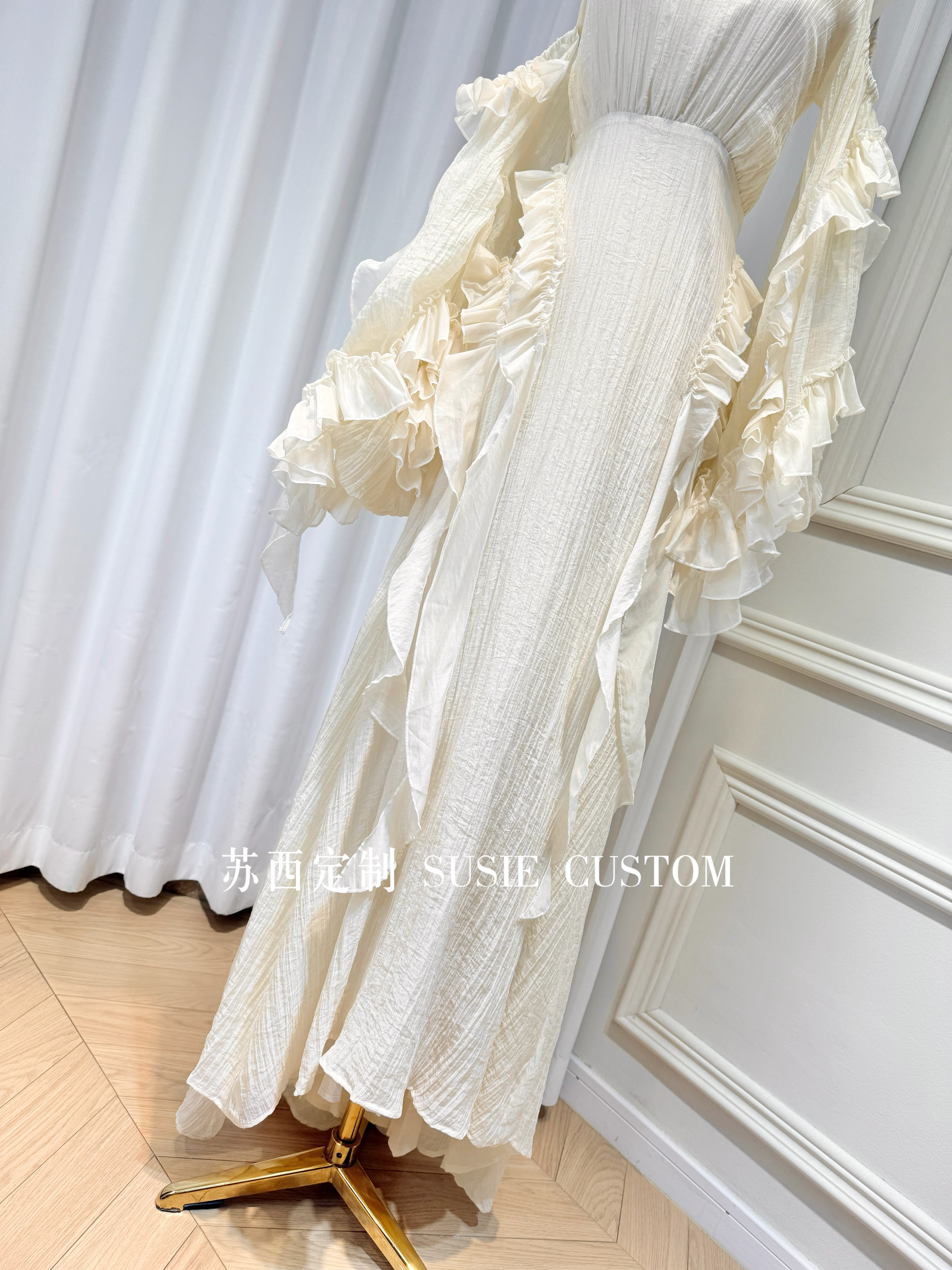 高定设计款斜肩露肩褶皱木耳边飘带大泡泡袖大摆拖地度假拖地长裙