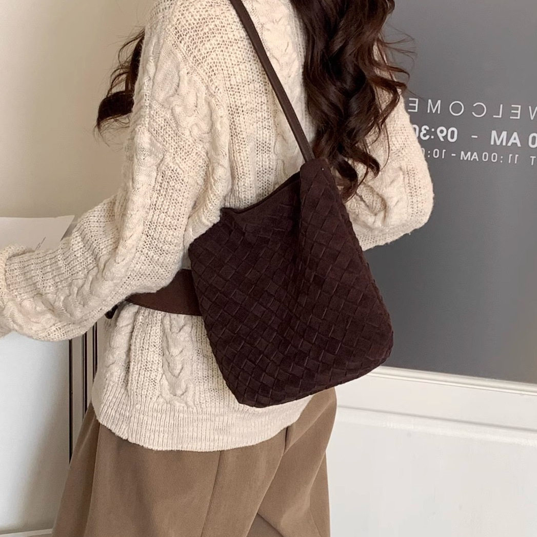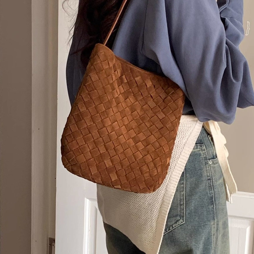 首页> 鞋包> 小众手工麂皮反绒头层牛皮编织水桶包2025新款复古风单肩斜挎包女