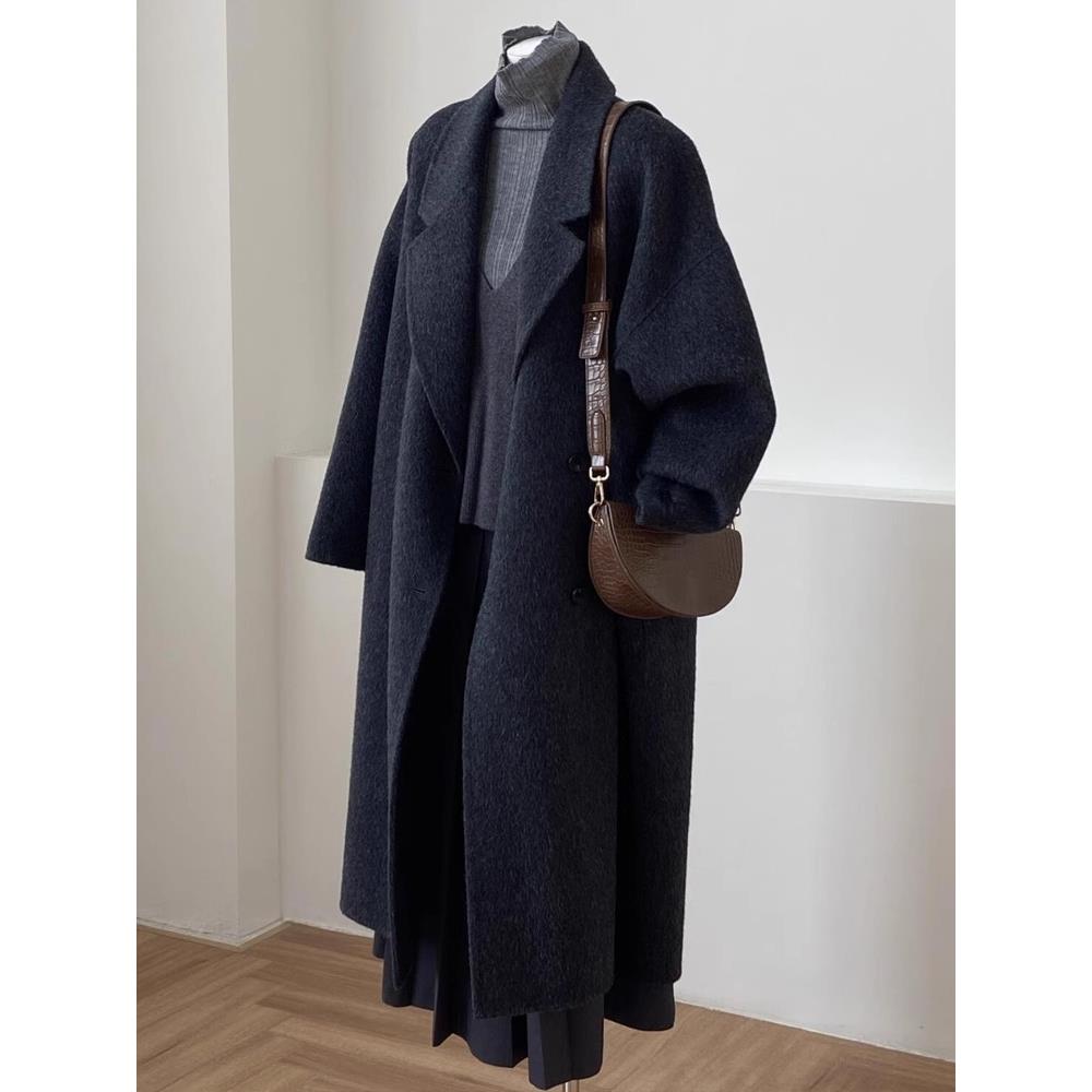 双面羊绒女装2024秋冬黑色和灰色新韩式宽松中长经典羊毛外套