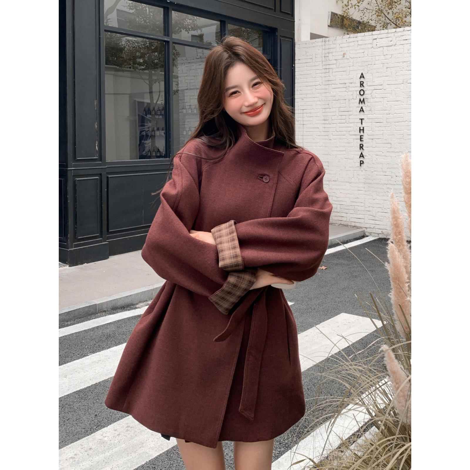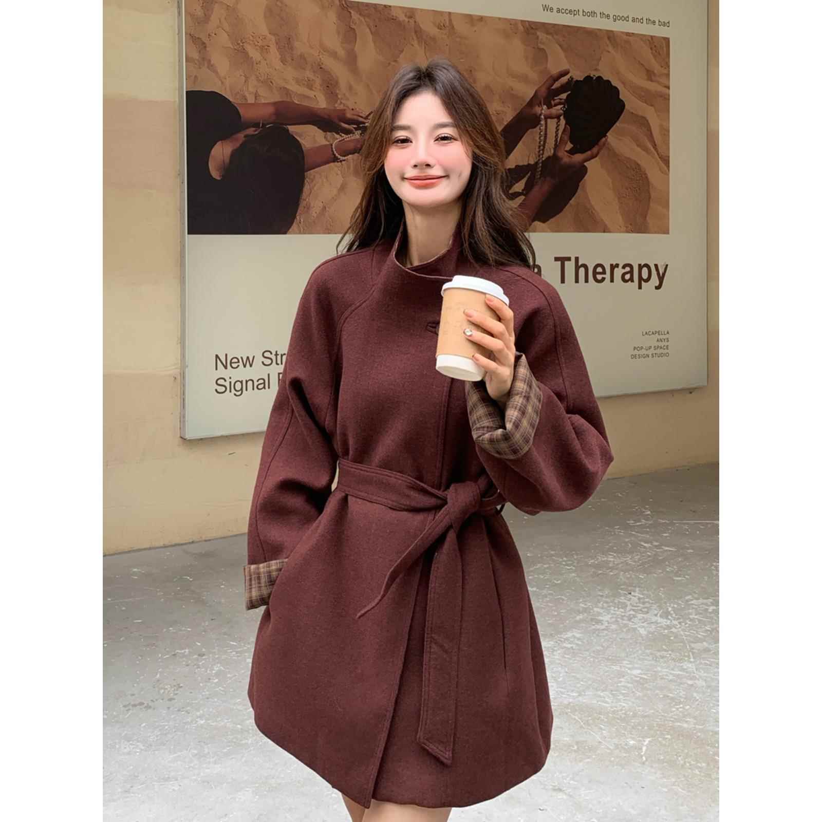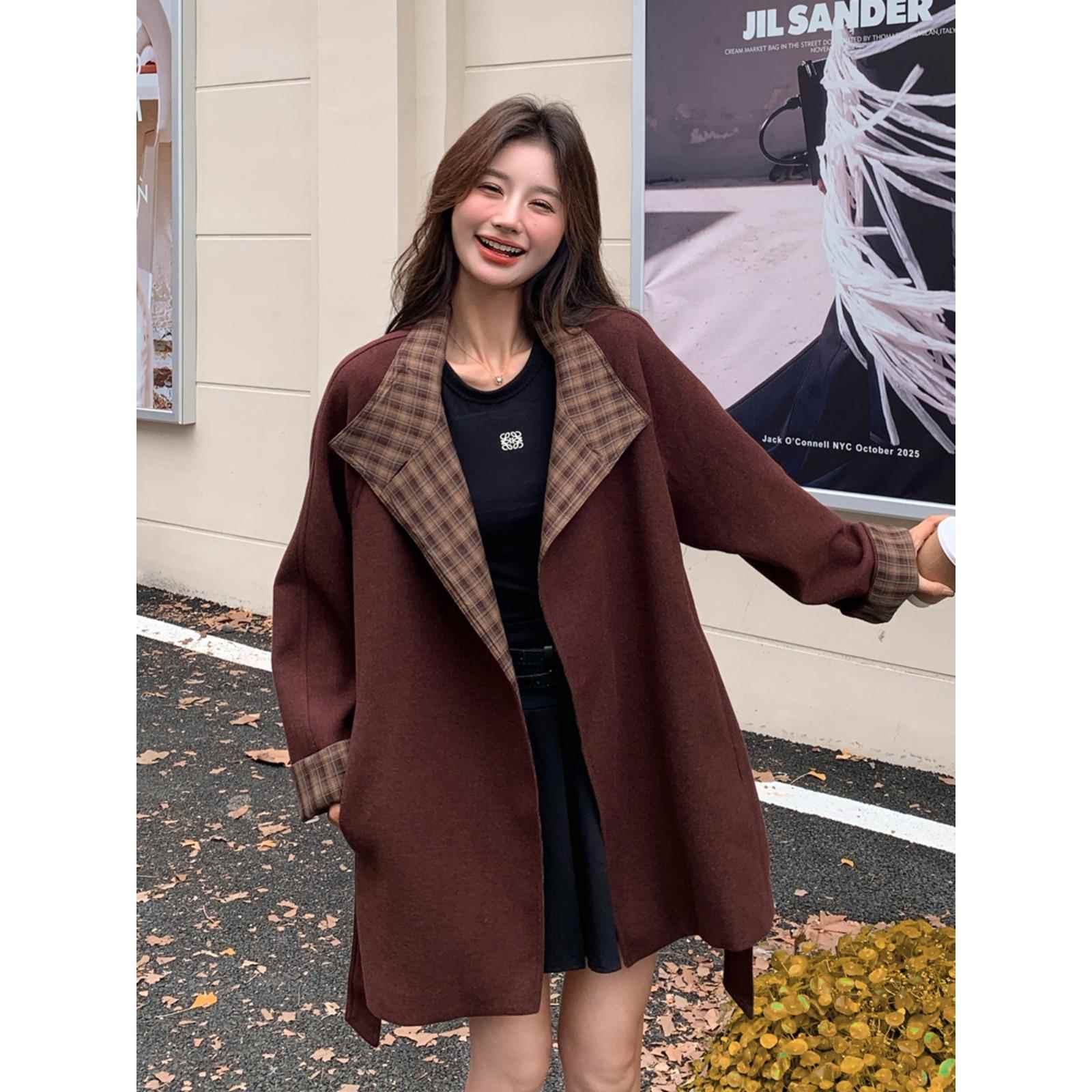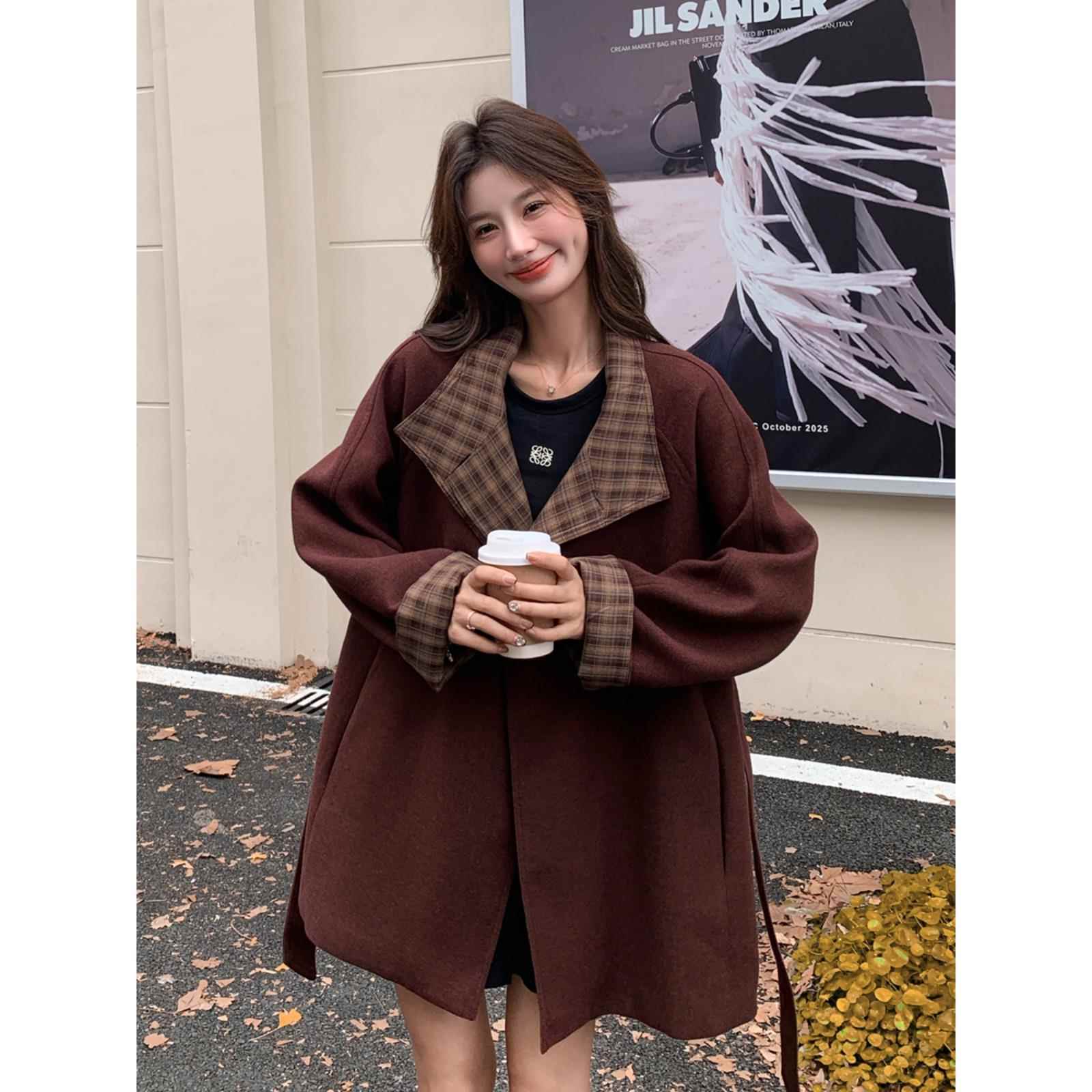 安可拉红毛呢大衣冬季女2024新款高级感格纹拼接宽松中长款呢外套