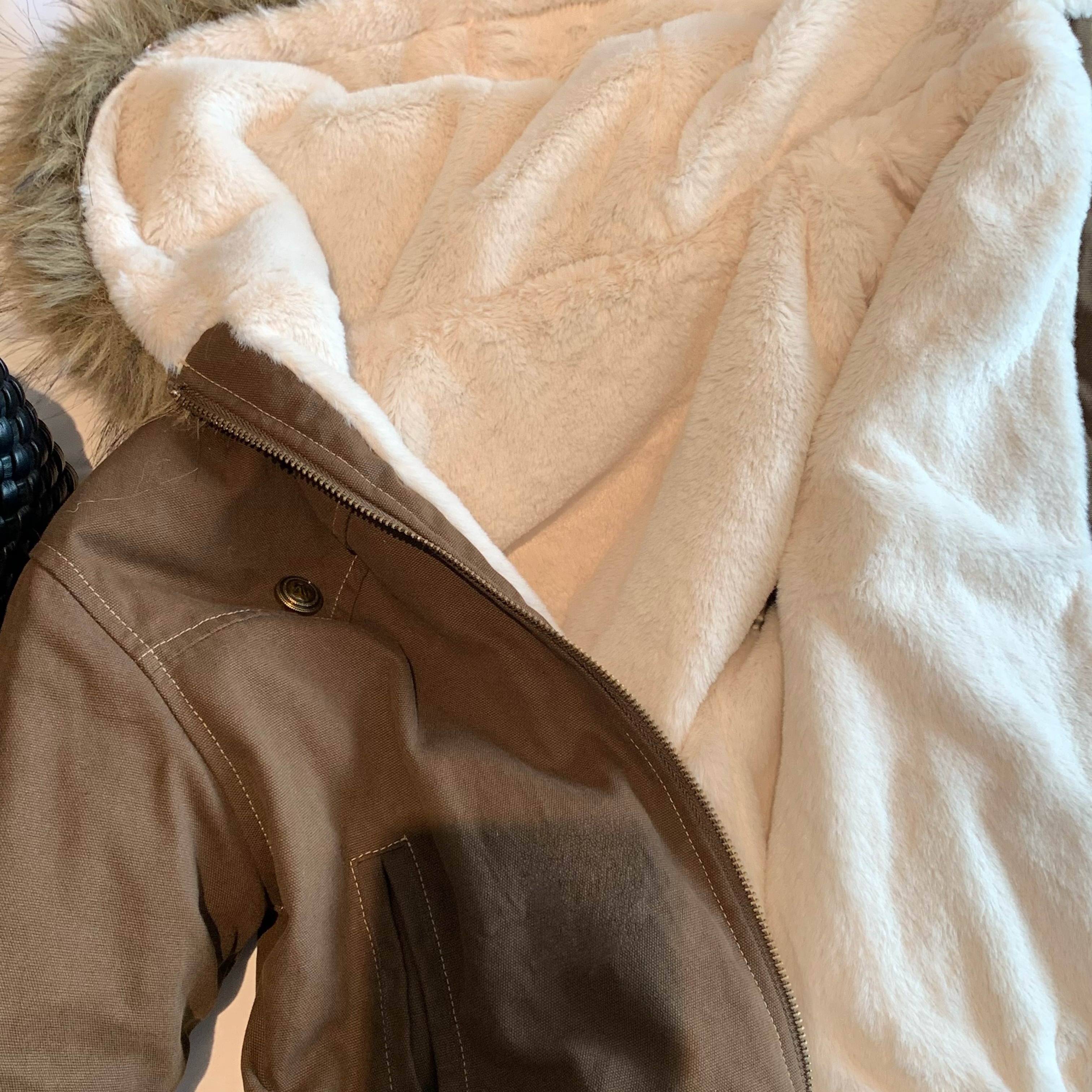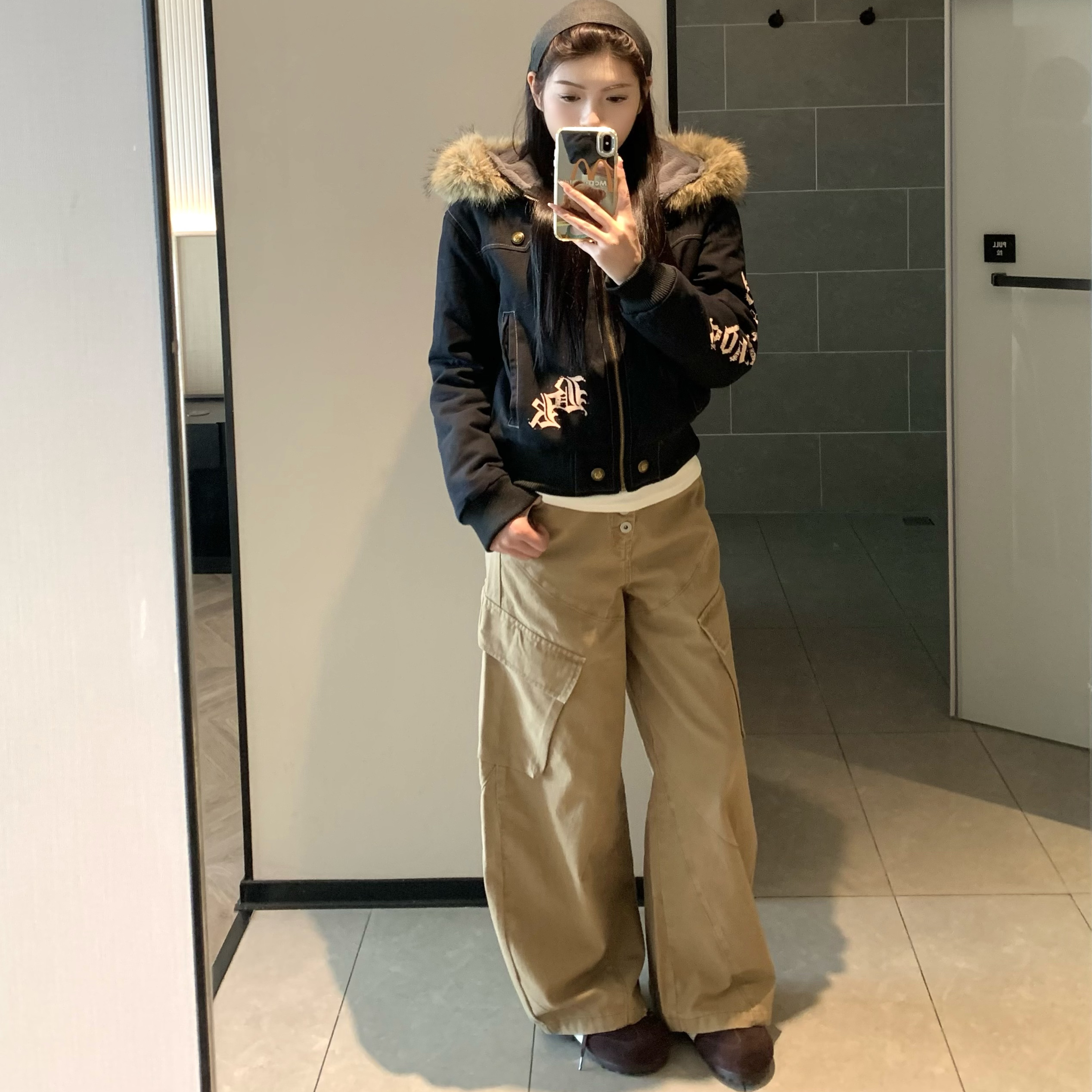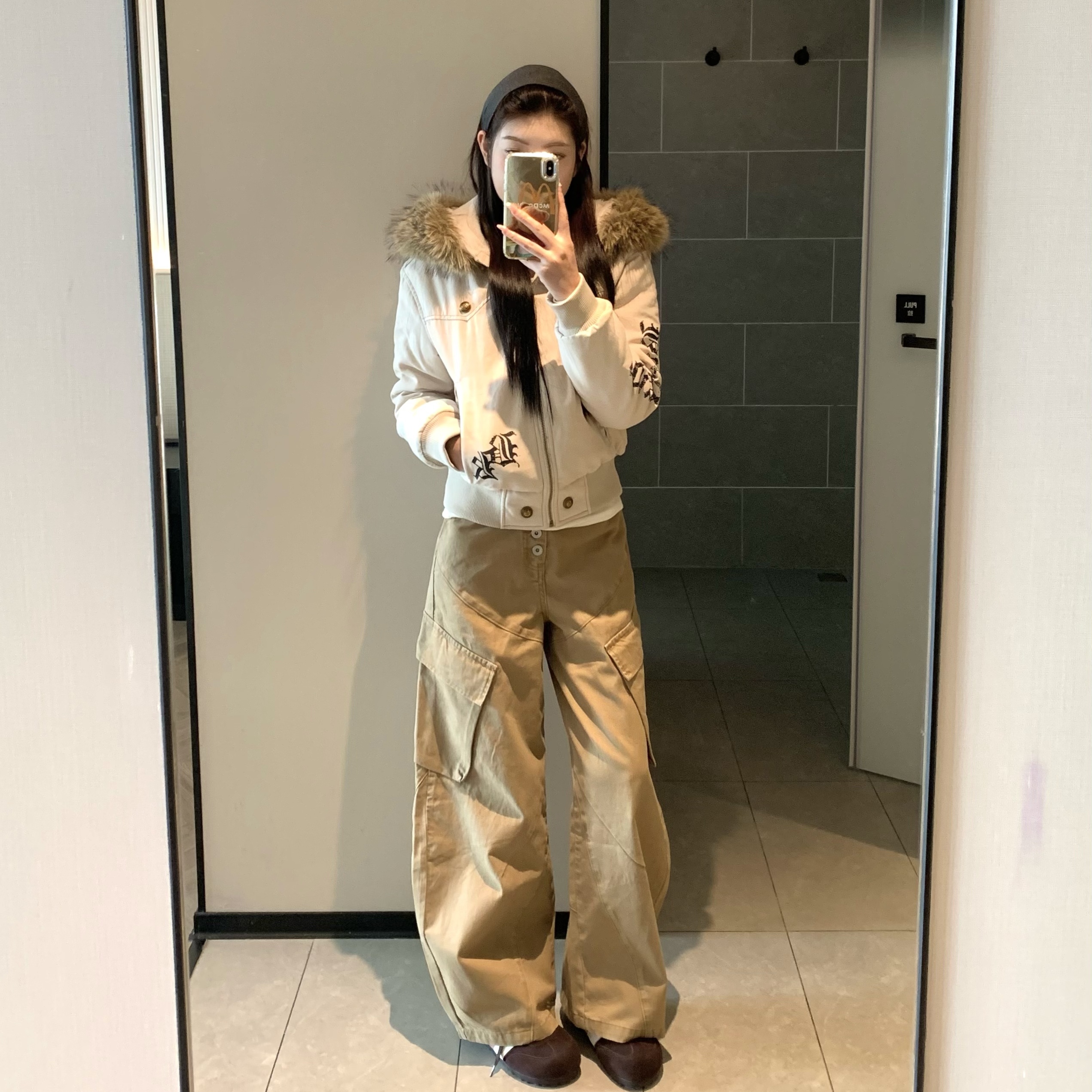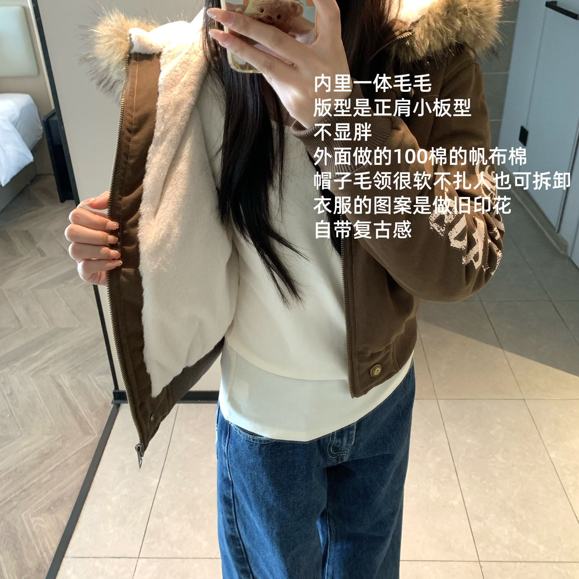 AMER 国潮美式复古字母小标大毛领设计棉服外套