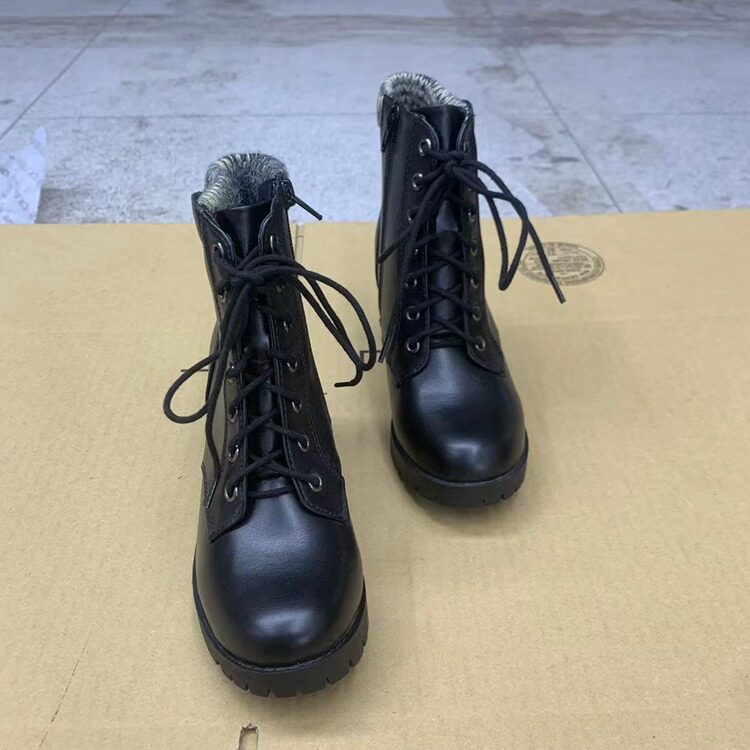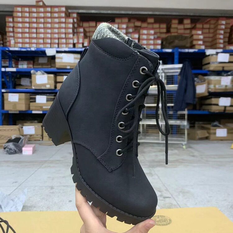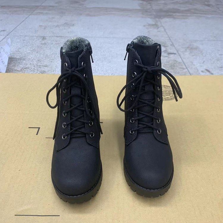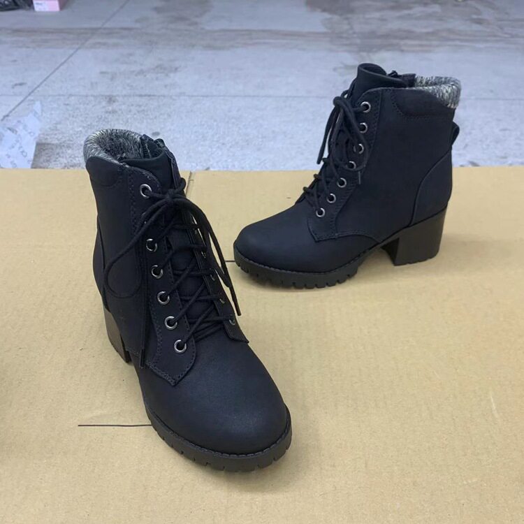 外贸原单女鞋领口针织圆头粗跟纯色系带侧拉链短靴百搭春秋单靴