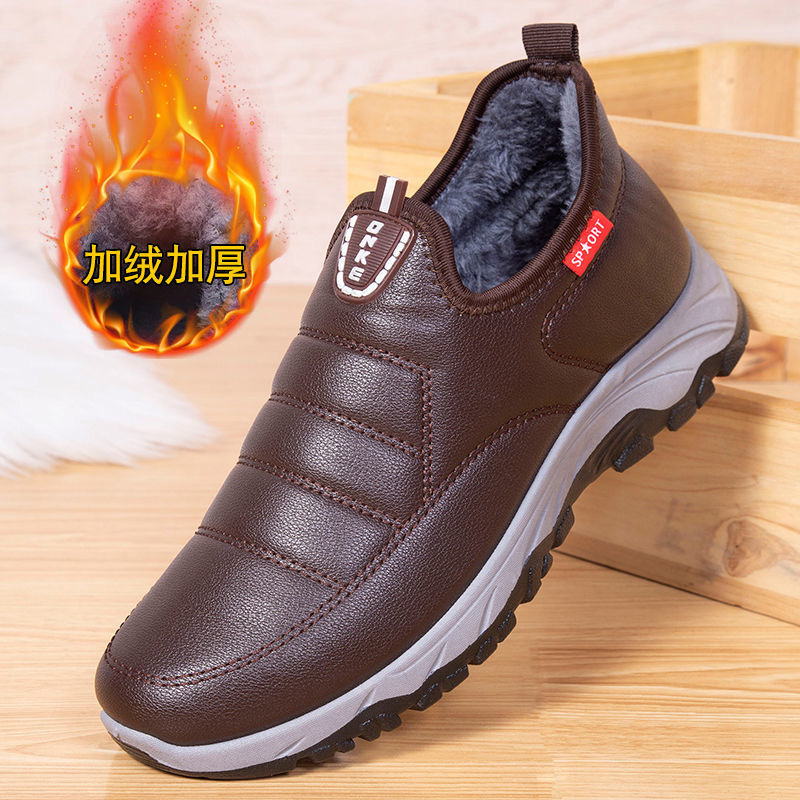 冬季老北京布鞋男加绒皮面防水棉靴软底加厚保暖老人棉鞋爸爸短靴