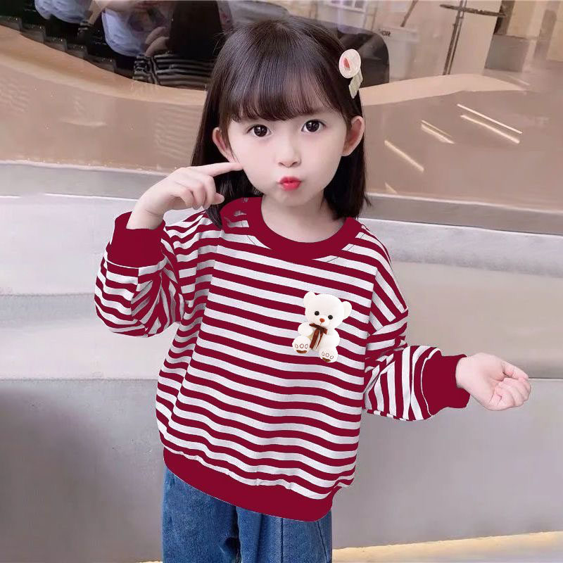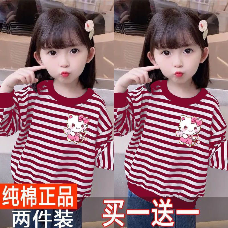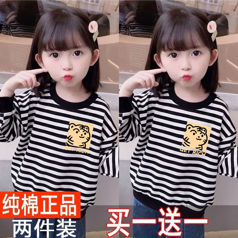 100%纯棉2023春秋季中小童儿童装条纹长袖T恤假两件上衣女童卫衣