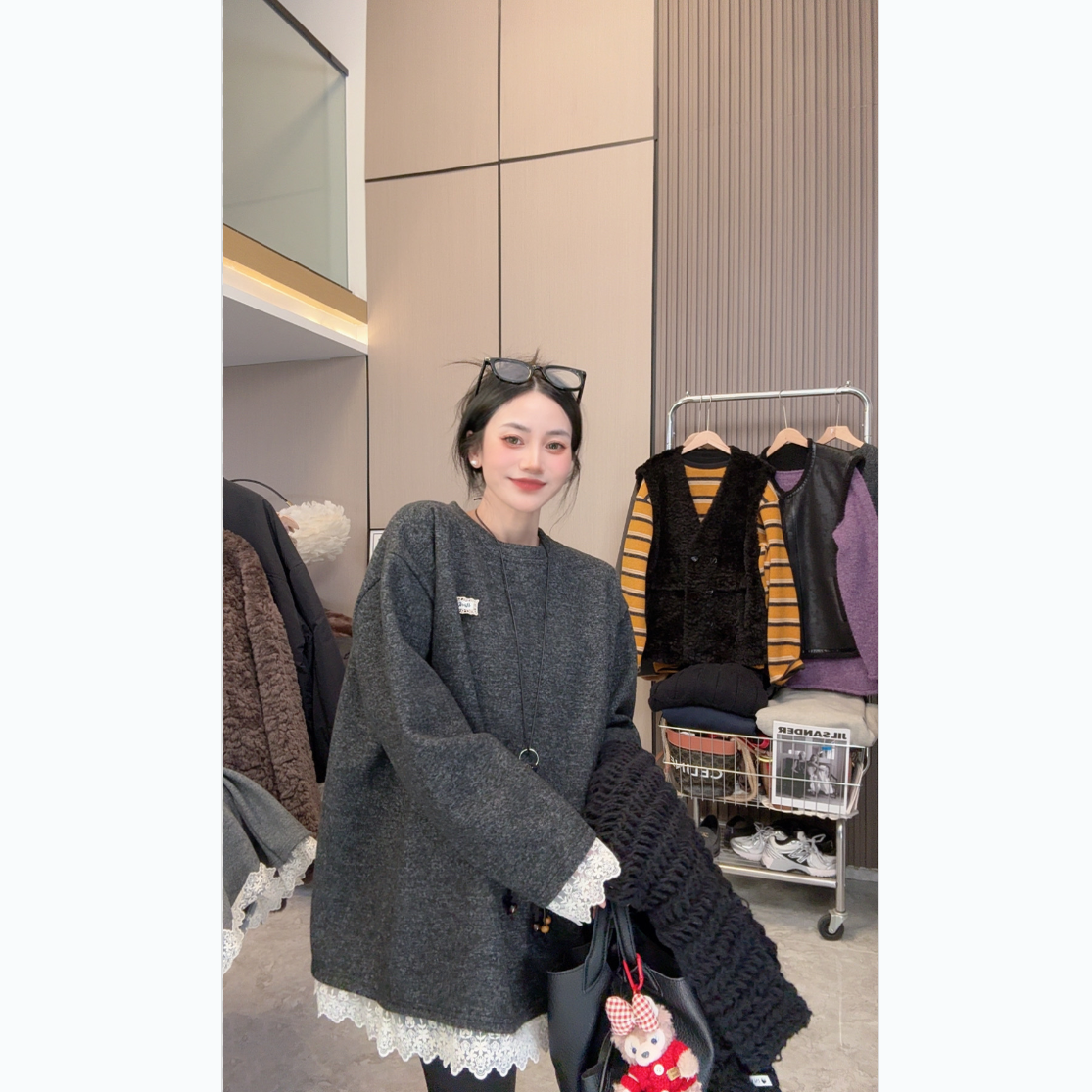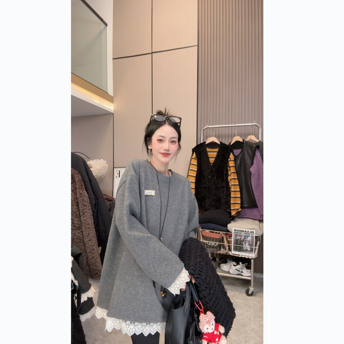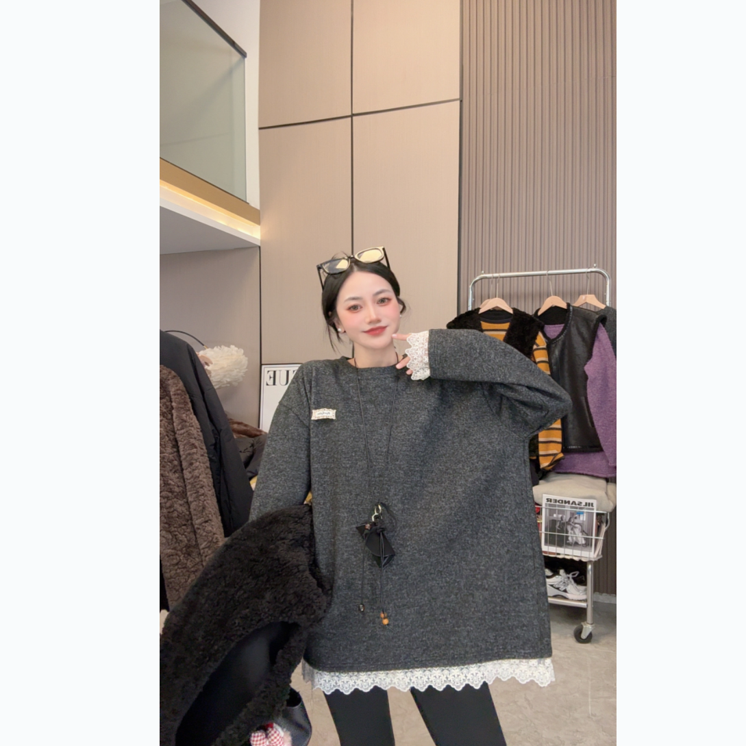 【星夜蕾丝】加绒加厚~设计款蕾丝拼接宽松中长款圆领长袖卫衣