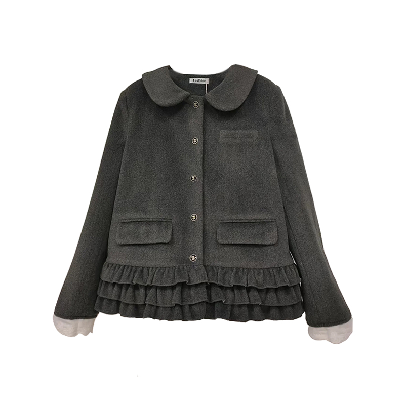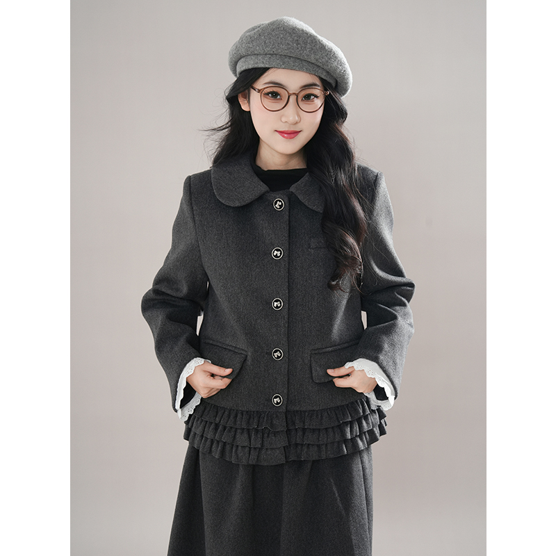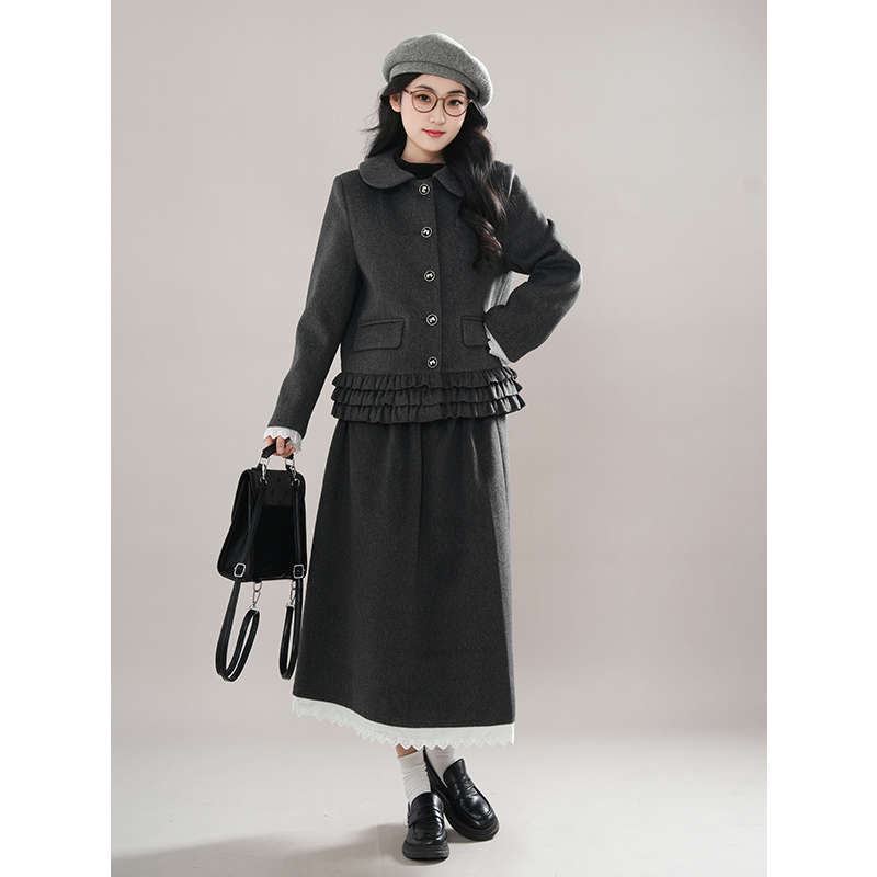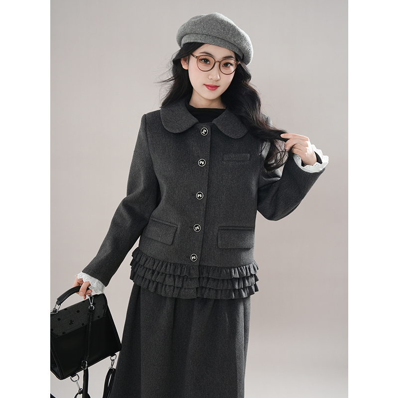 日系留洋千金风木耳边娃娃领夹棉西装外套+蕾丝花边伞裙两件套装