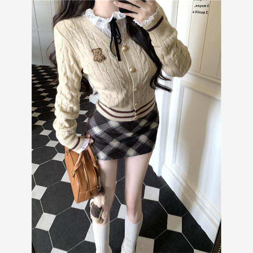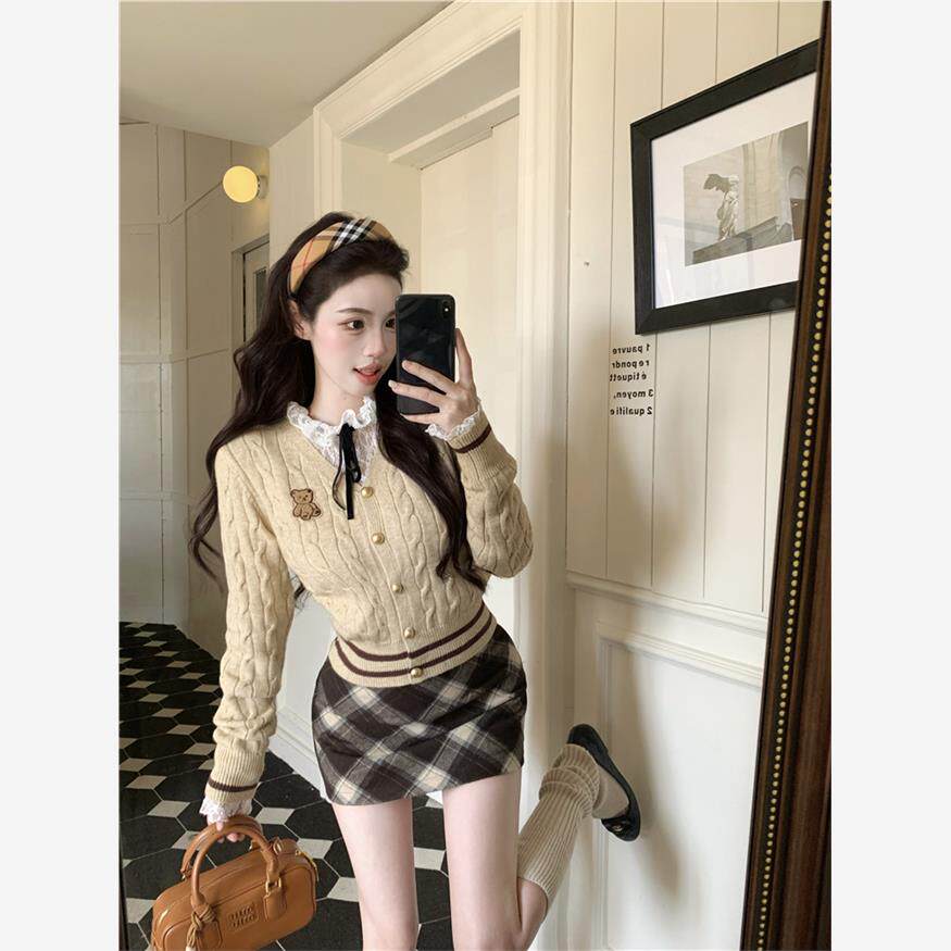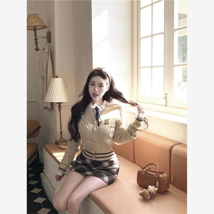 学院风套装女麻花针织开衫外套内搭蕾丝衬衫上衣冬季半身裙三件套