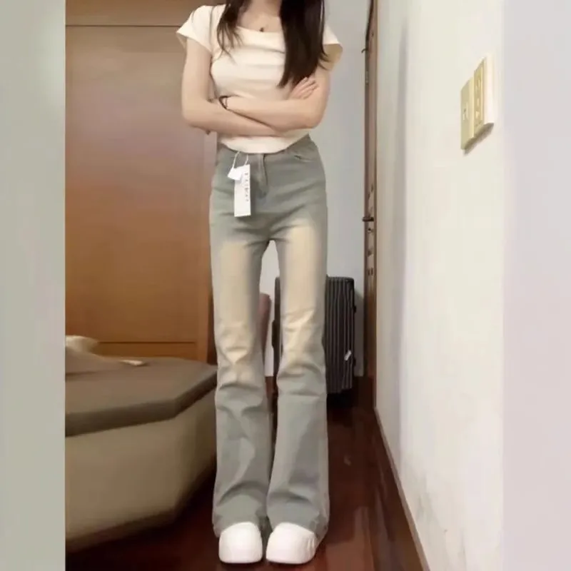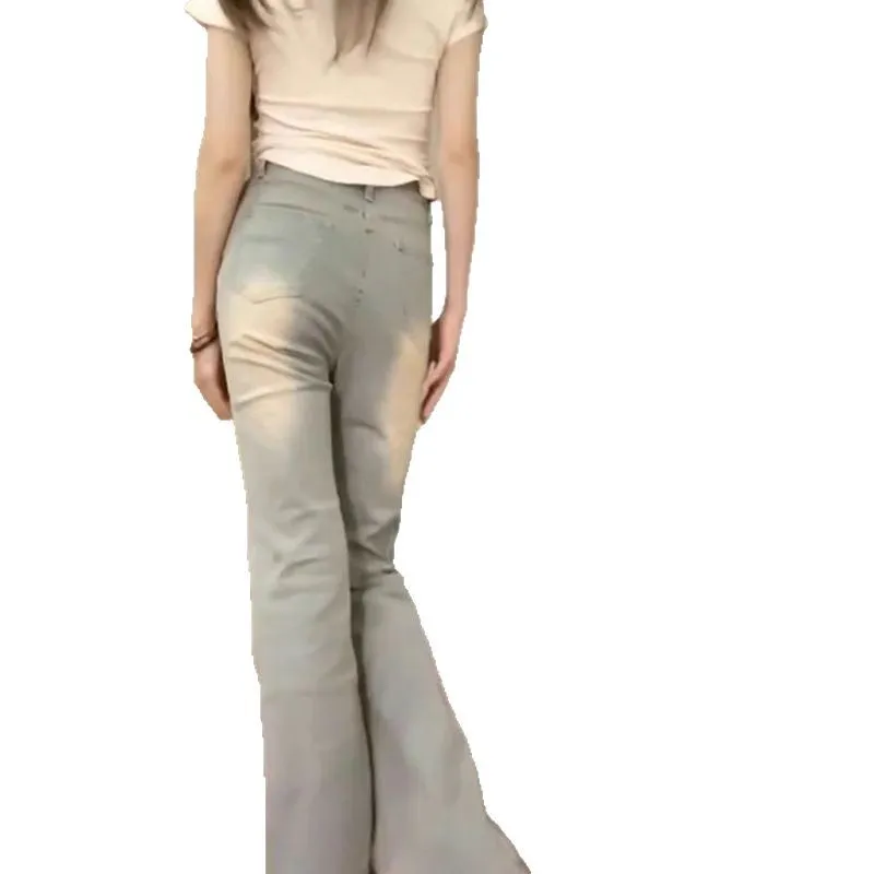 美式微喇叭牛仔裤女春秋复古黄泥色高腰弹力显瘦小个子马蹄长裤子
