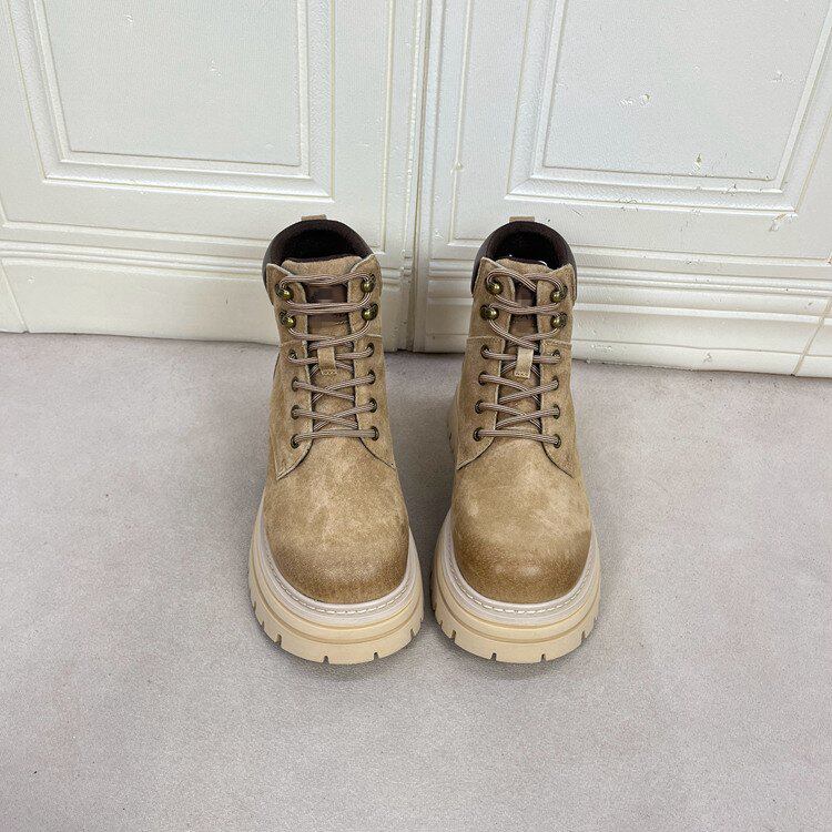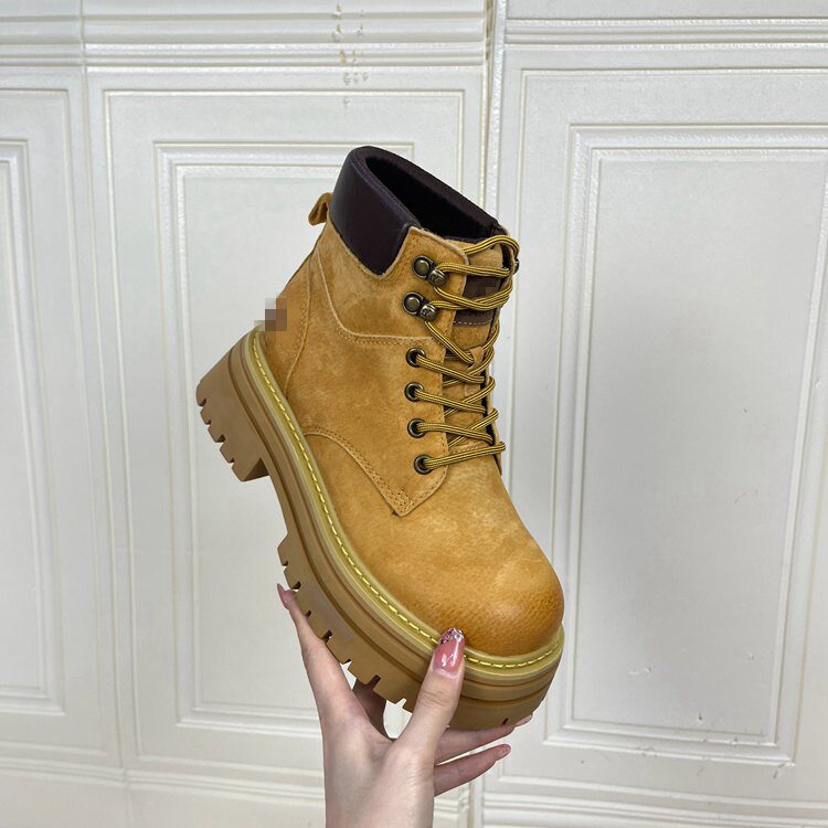 首页> 鞋包> 外面原单女靴真皮微瑕圆头纯色厚底粗跟系带短靴时尚户外登山靴