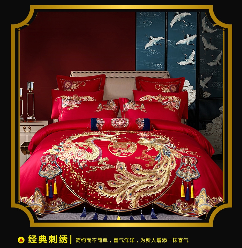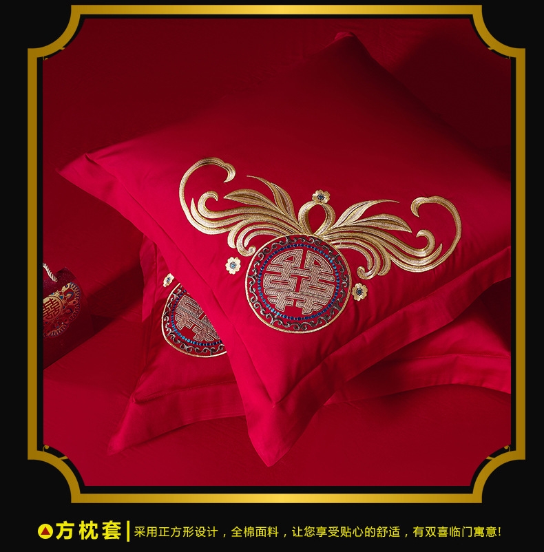 高端婚庆140支长绒棉绣花结婚四件套全棉贡缎大红六件套/十件套