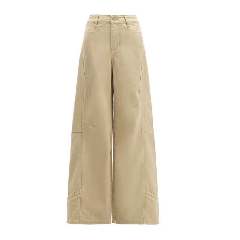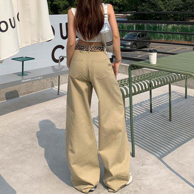 卡其色阔腿牛仔裤女2025秋季新款美式复古低腰拼接宽松显瘦拖地裤
