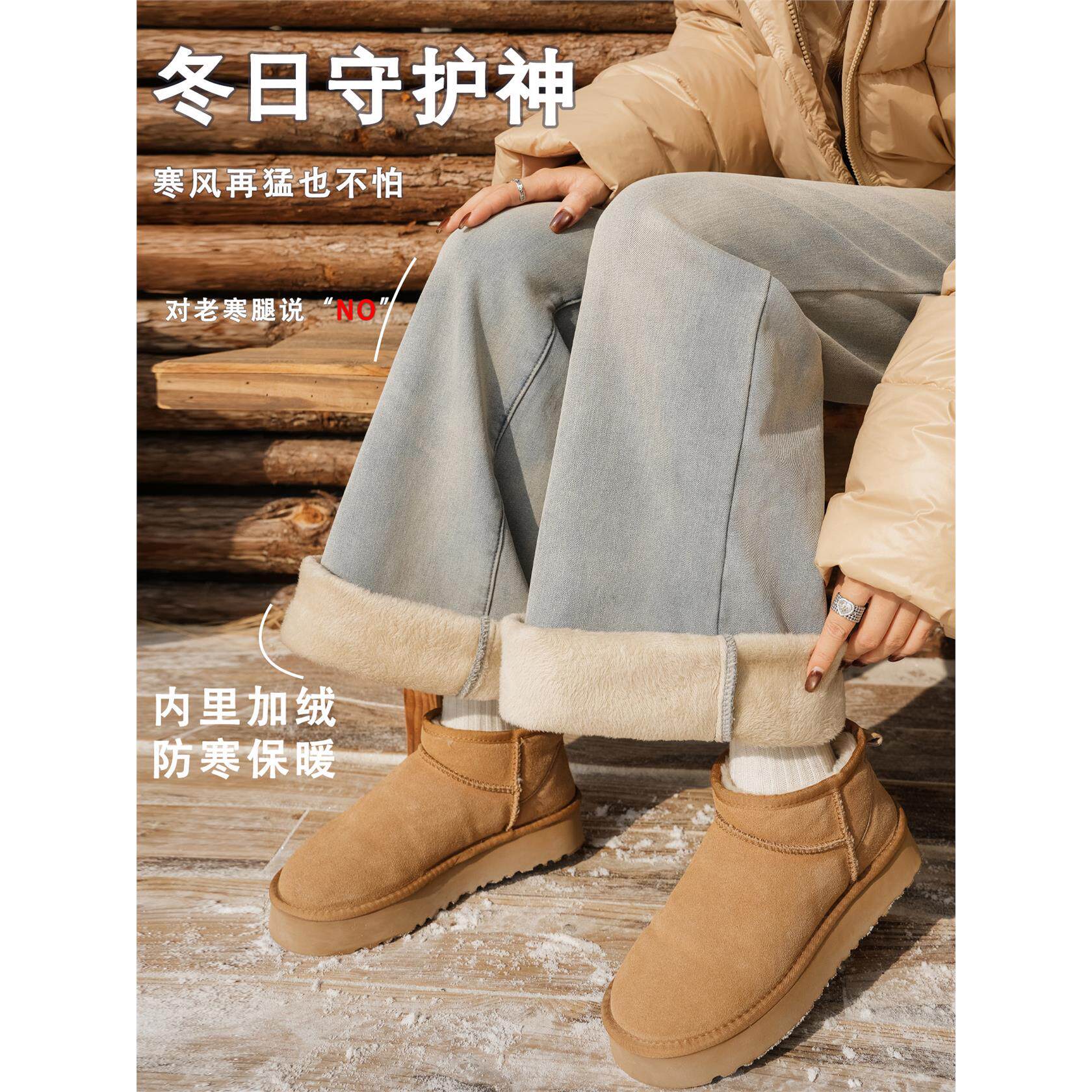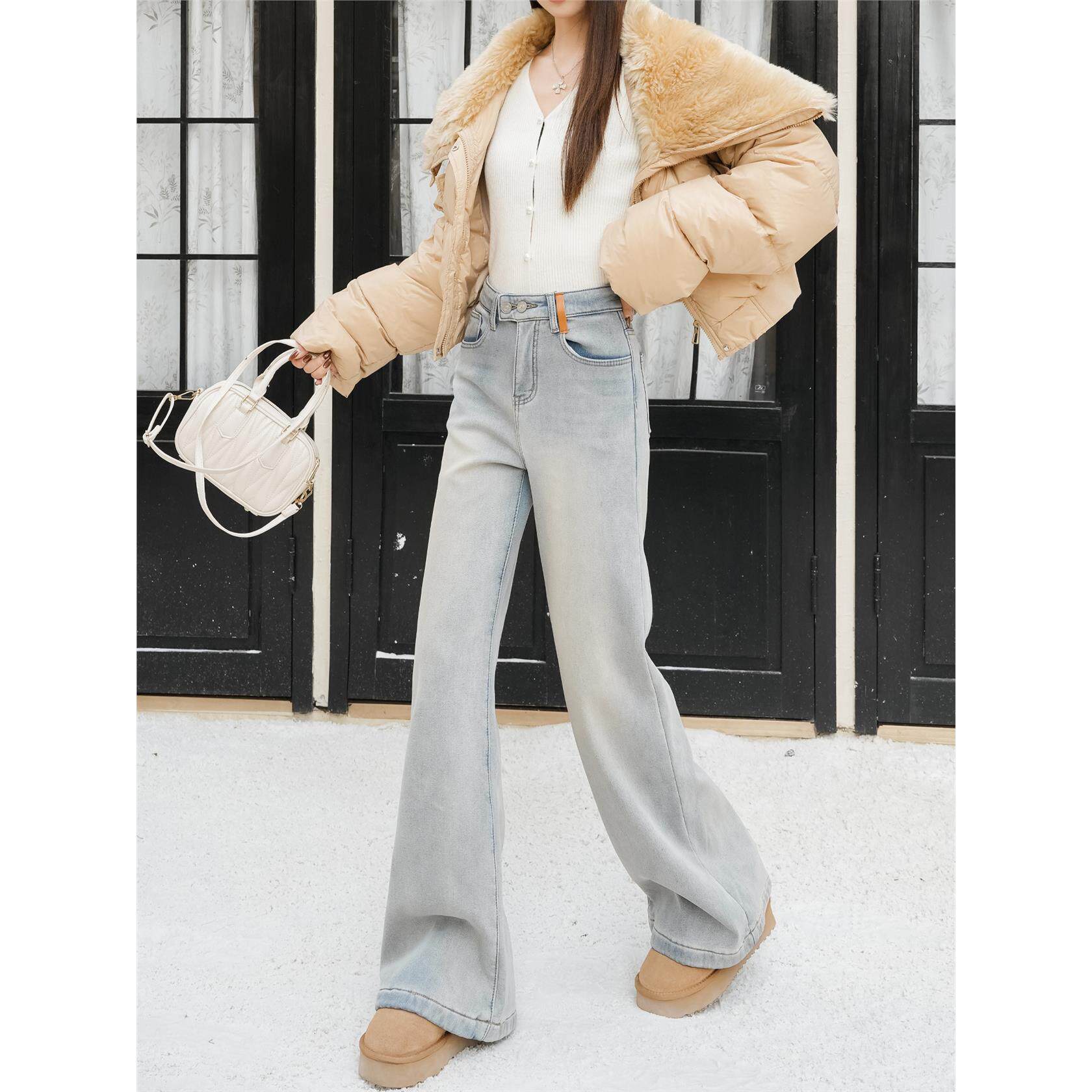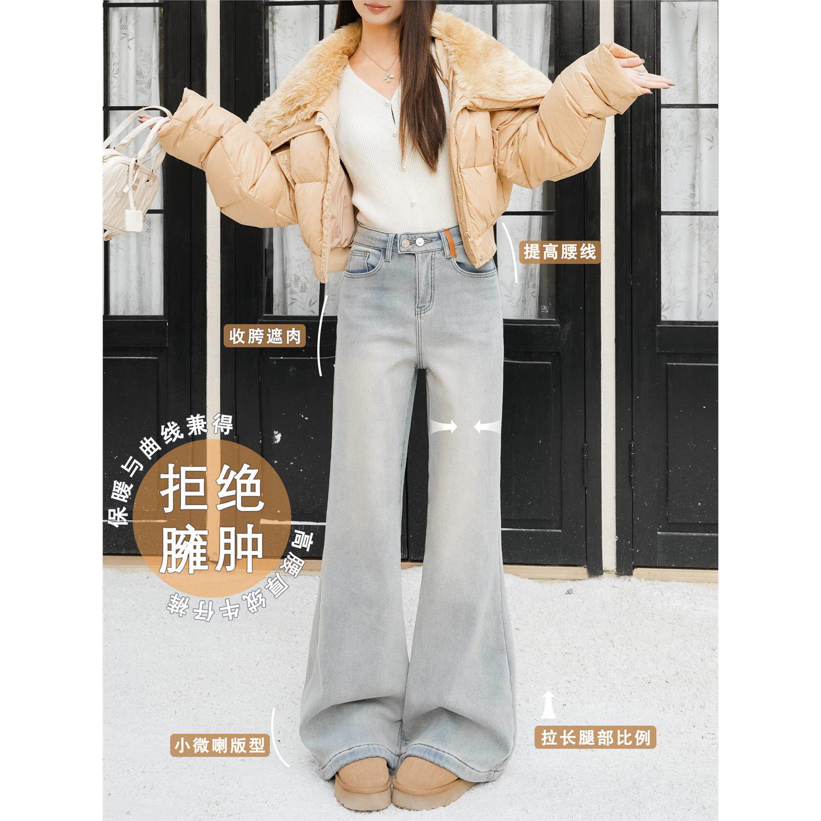 秋冬加绒加厚浅蓝微喇牛仔裤女宽松不贴腿小狗刺绣弹力直筒喇叭裤
