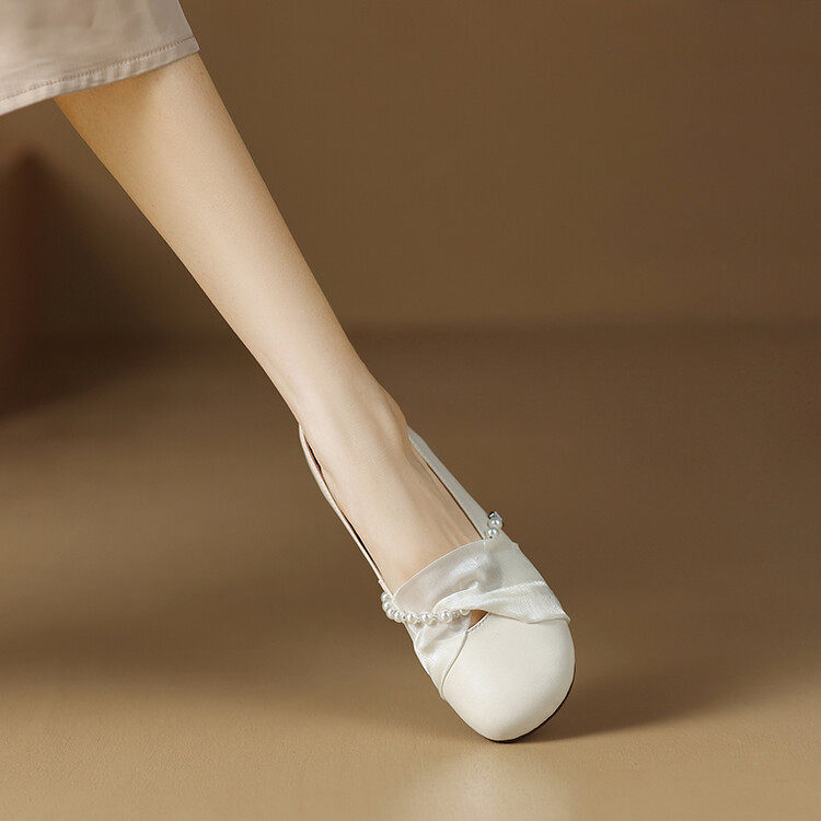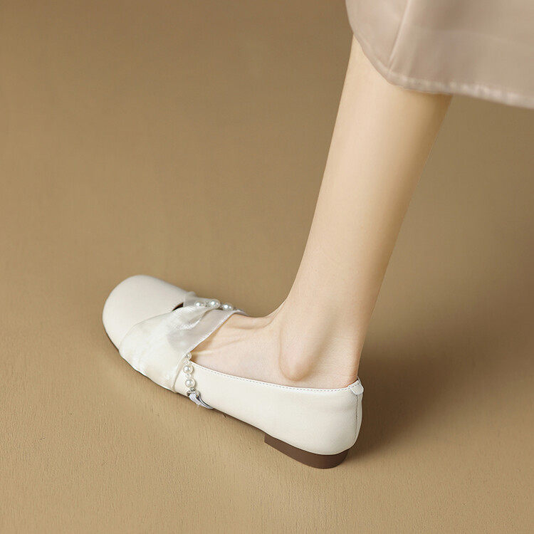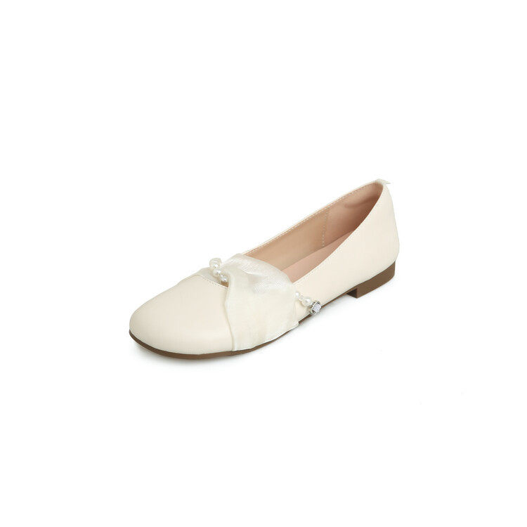 温柔仙女风网纱珍珠扣带舒适柔软奶奶鞋女春夏季新款浅色平底单鞋