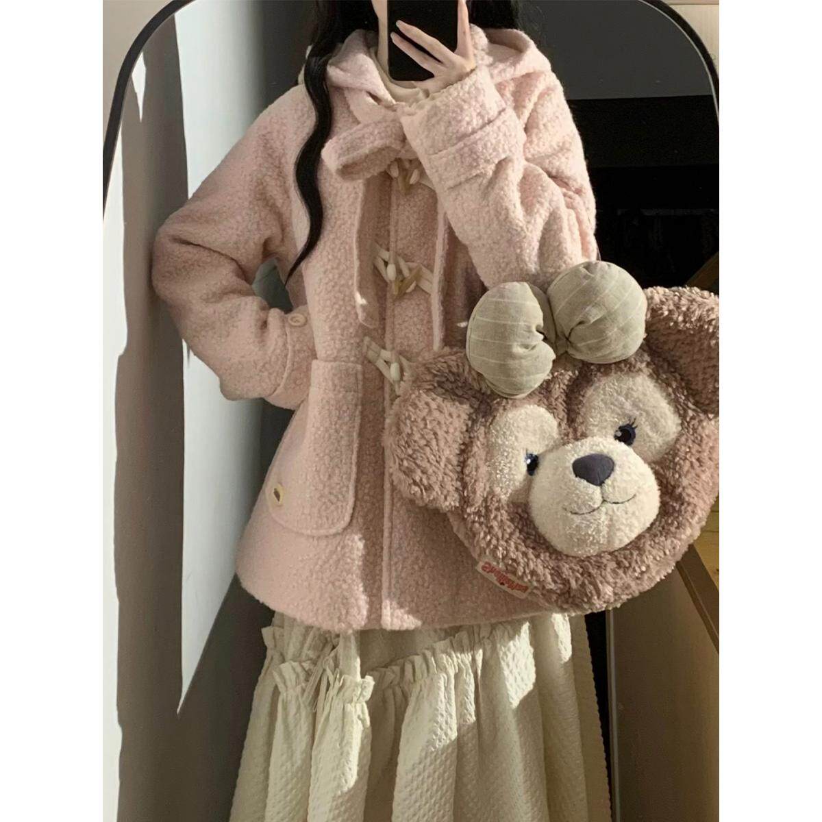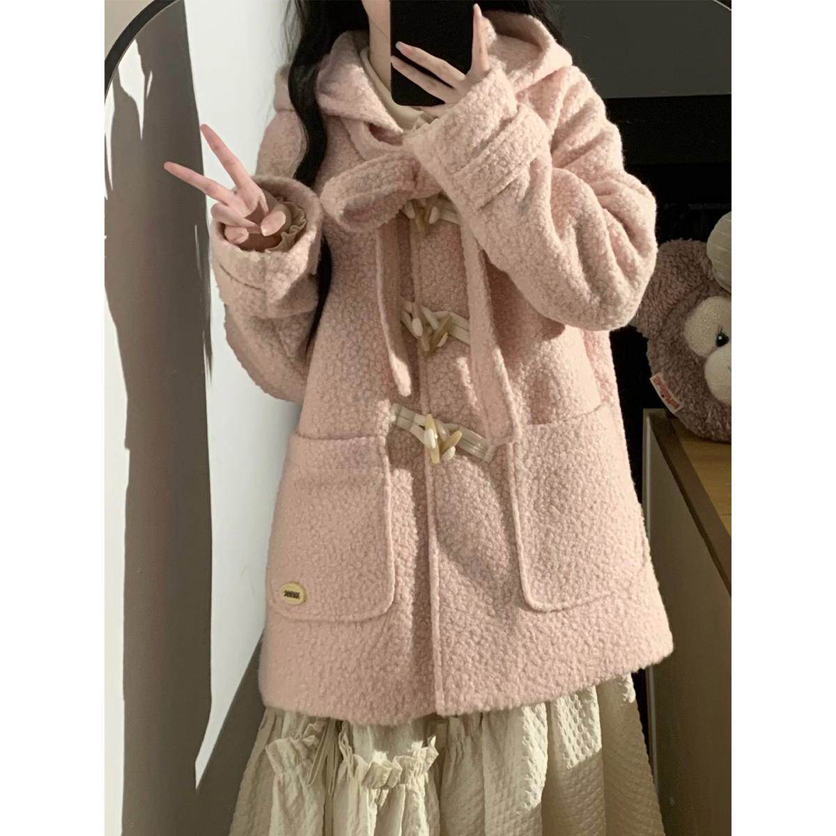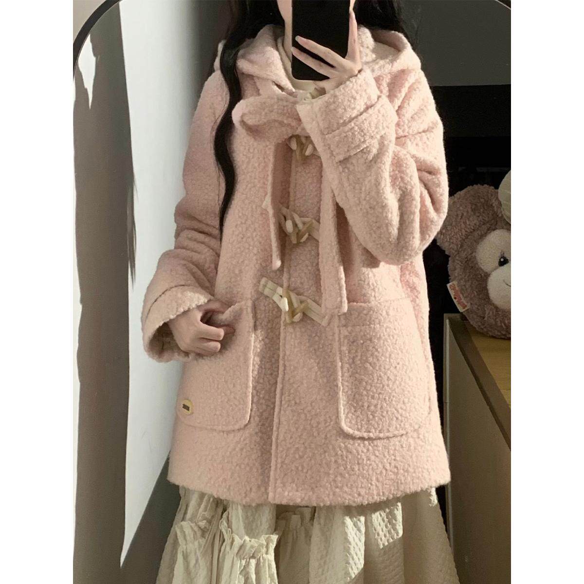 PINKDOG粉狗家 棉花糖 粉色呢子牛角扣大衣蝴蝶结连帽毛呢外套女