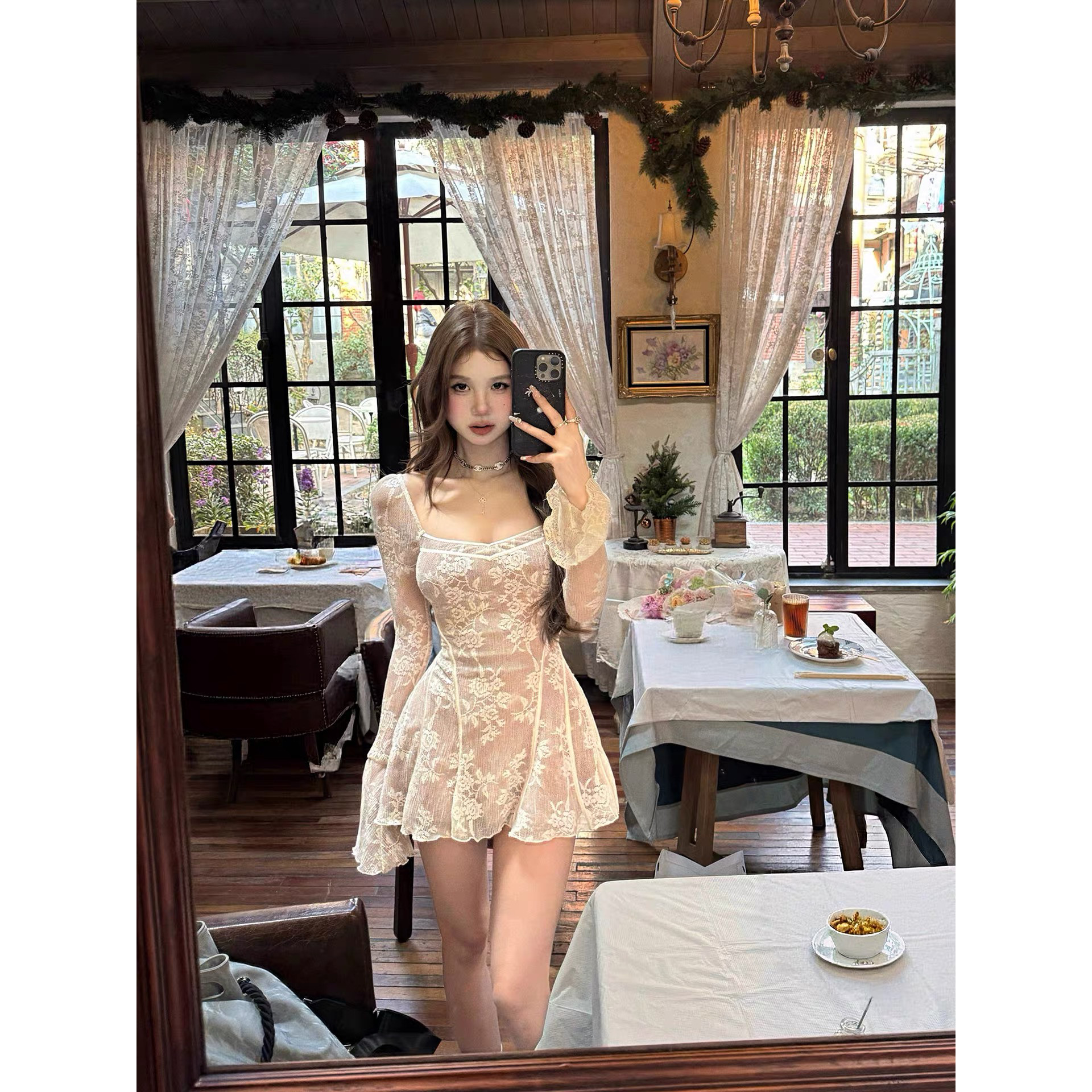 Tongiiuu 双生美神 重工蕾丝长袖连衣裙女辣妹收腰显瘦a字短裙春
