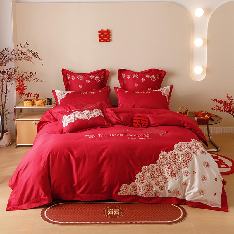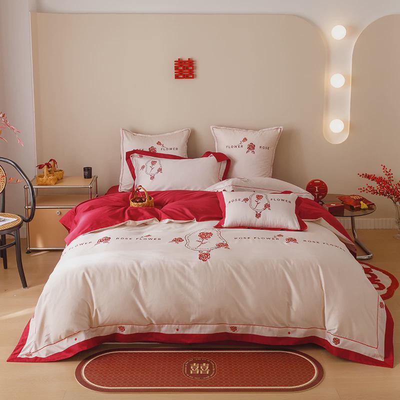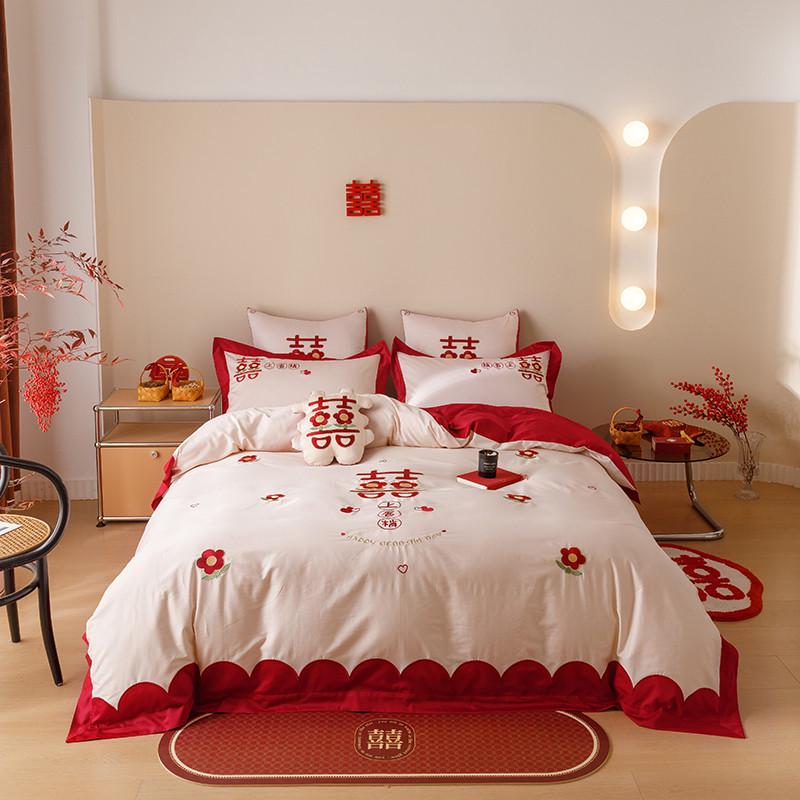 inc0婚庆60支长绒棉轻奢四件套红色字囍刺绣双人1.8米床上用