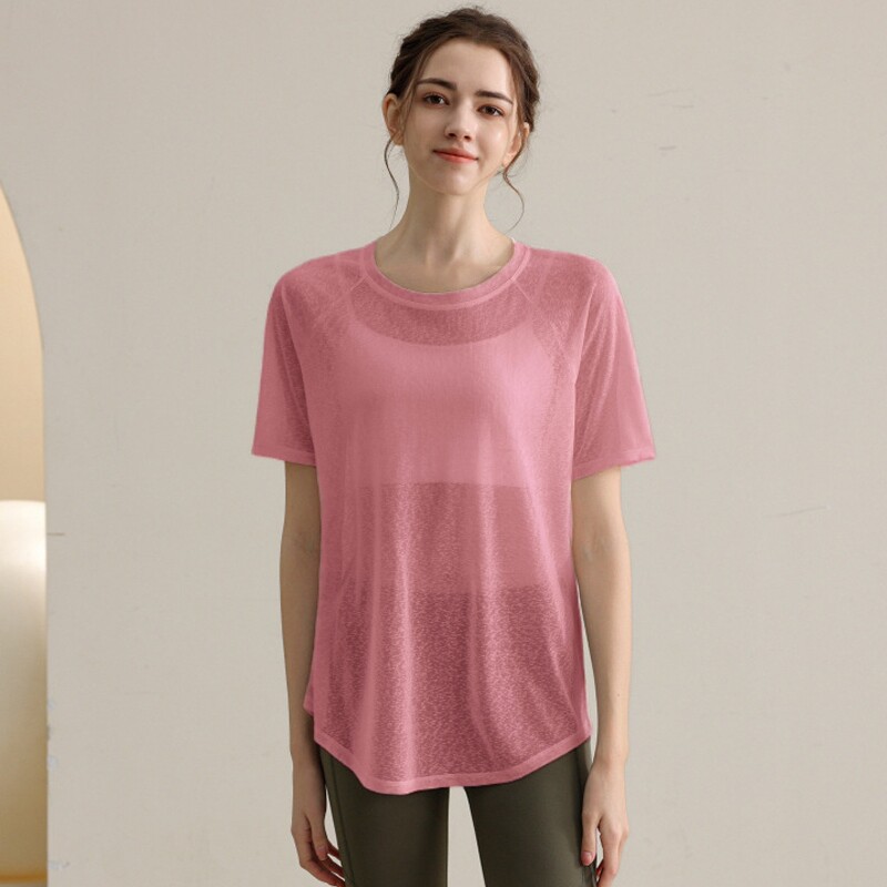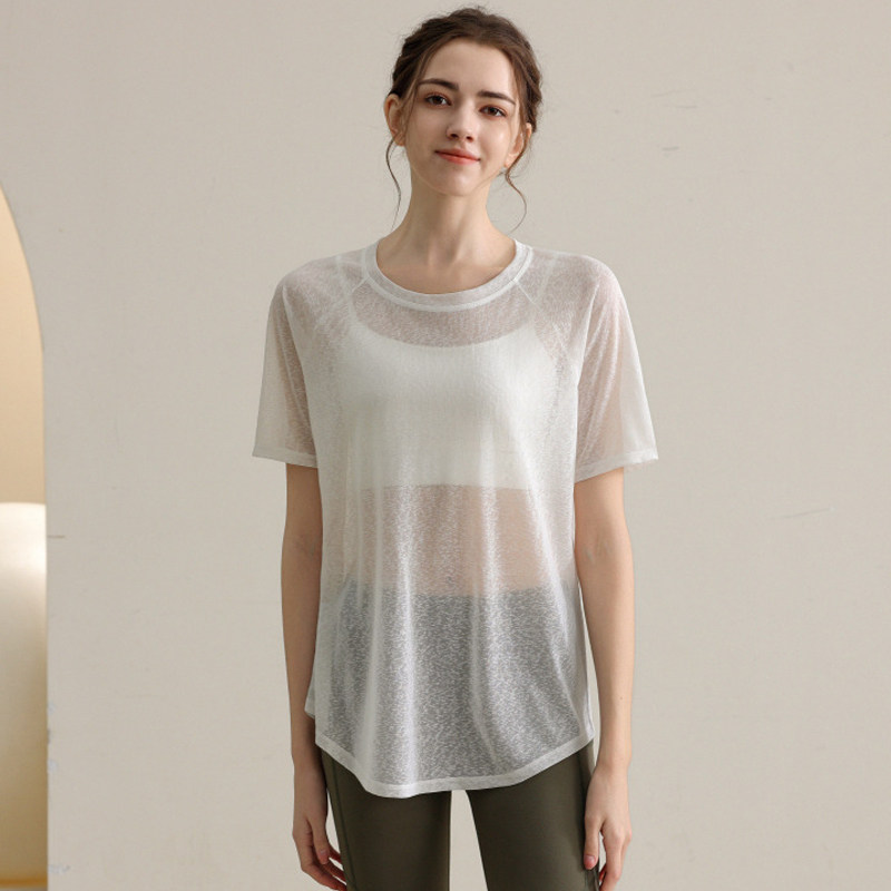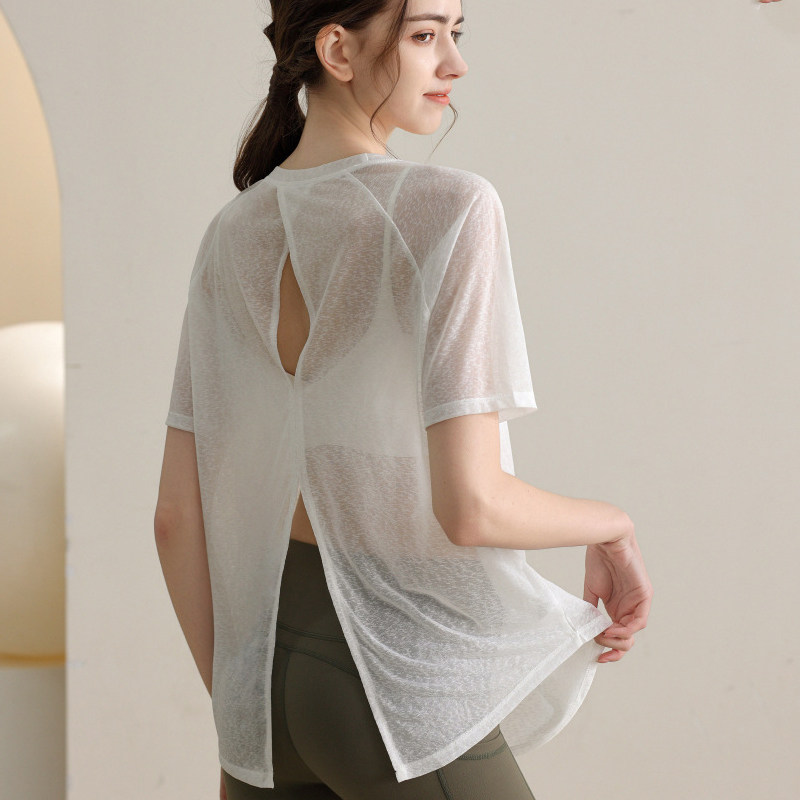 透明健身宽松版运动短袖女速干美背开叉可打结跑步瑜伽罩衫透气薄
