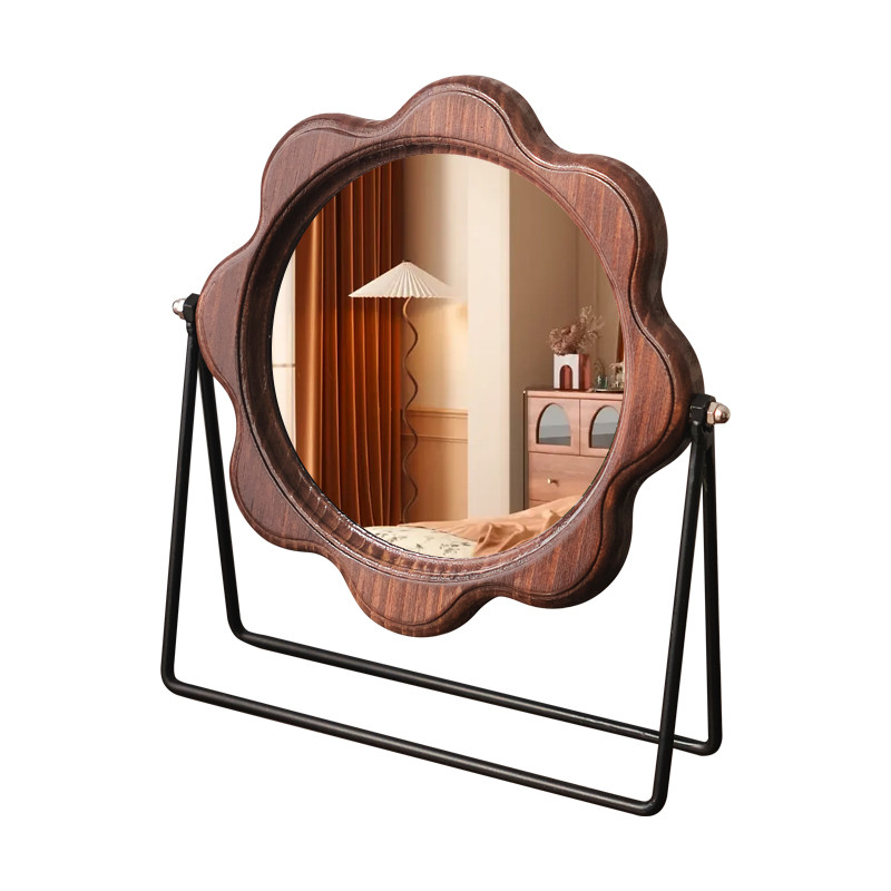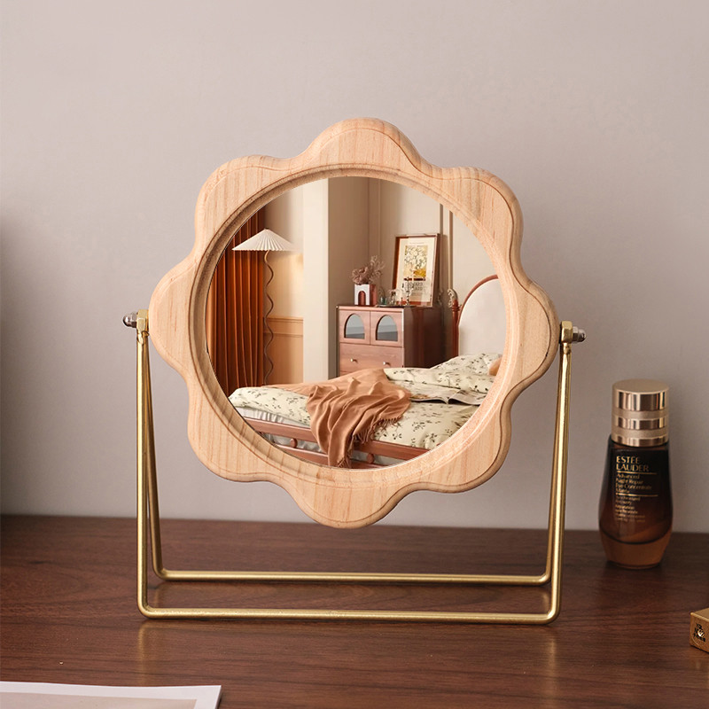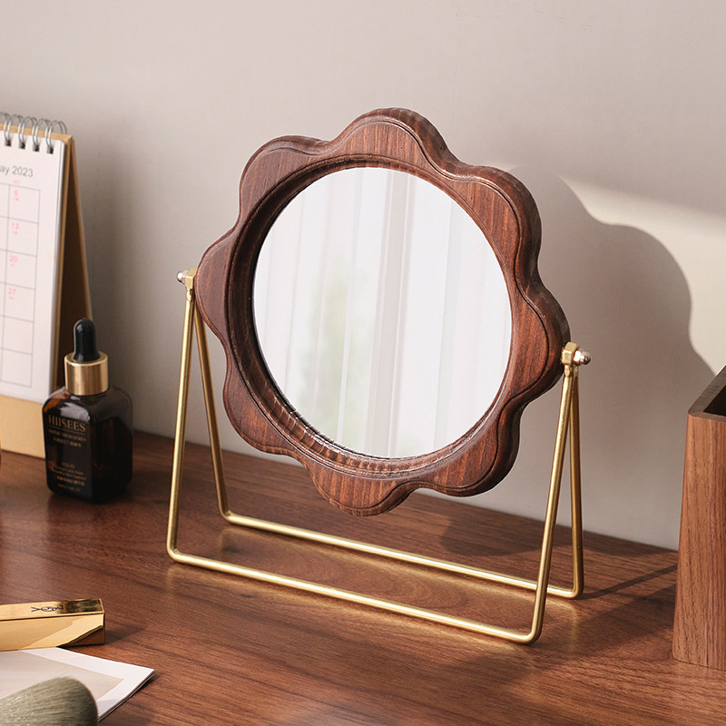 台式化妆镜欧式镜子简约复古国风木质梳妆镜便携宿舍桌面镜可