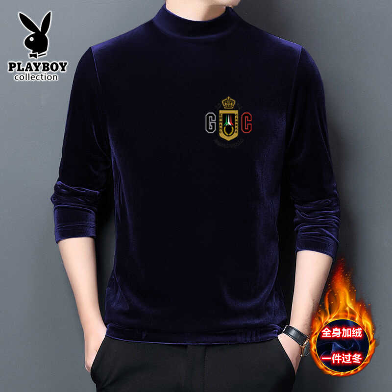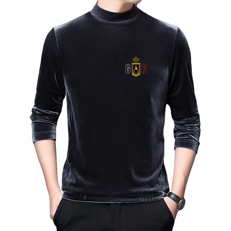 秋冬加绒加厚金丝绒卫衣男半高领修身中年长袖纯色印花上衣打底衫