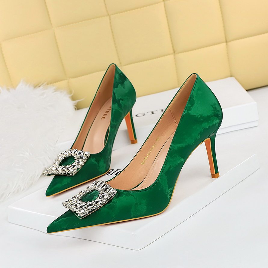 欧美风宴会修脚显瘦女鞋细跟高跟浅口尖头金属水钻扣单鞋
