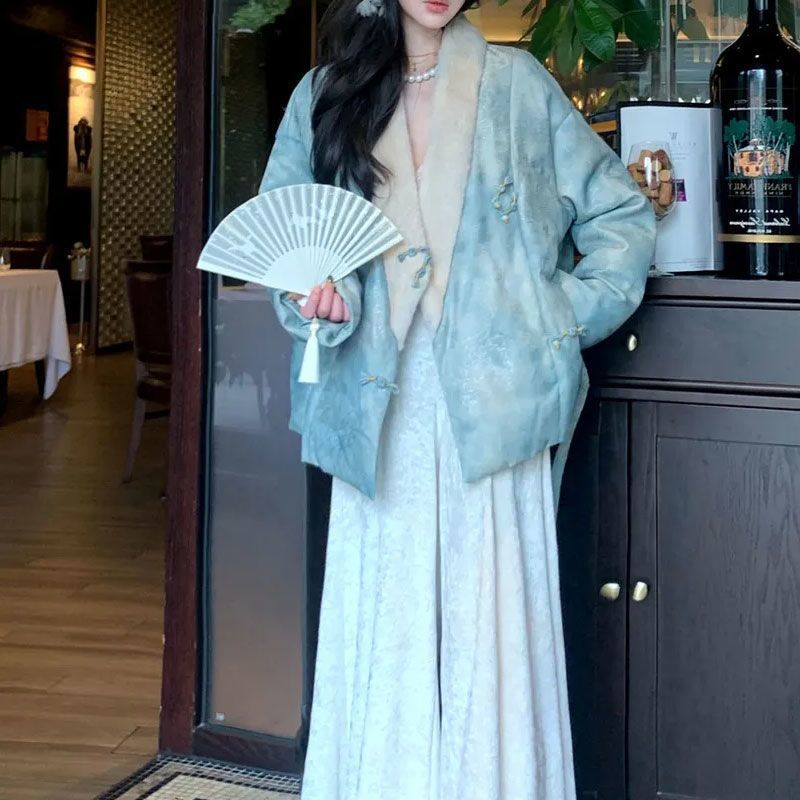 2024秋冬新中式高级感印花V领拼接国风版棉服保暖日常百搭两件套