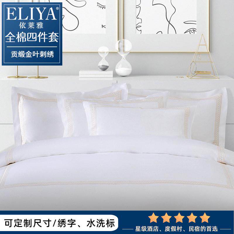 五星级酒店床上用品厂家定制白色纯棉贡缎全棉四件套刺绣绣花