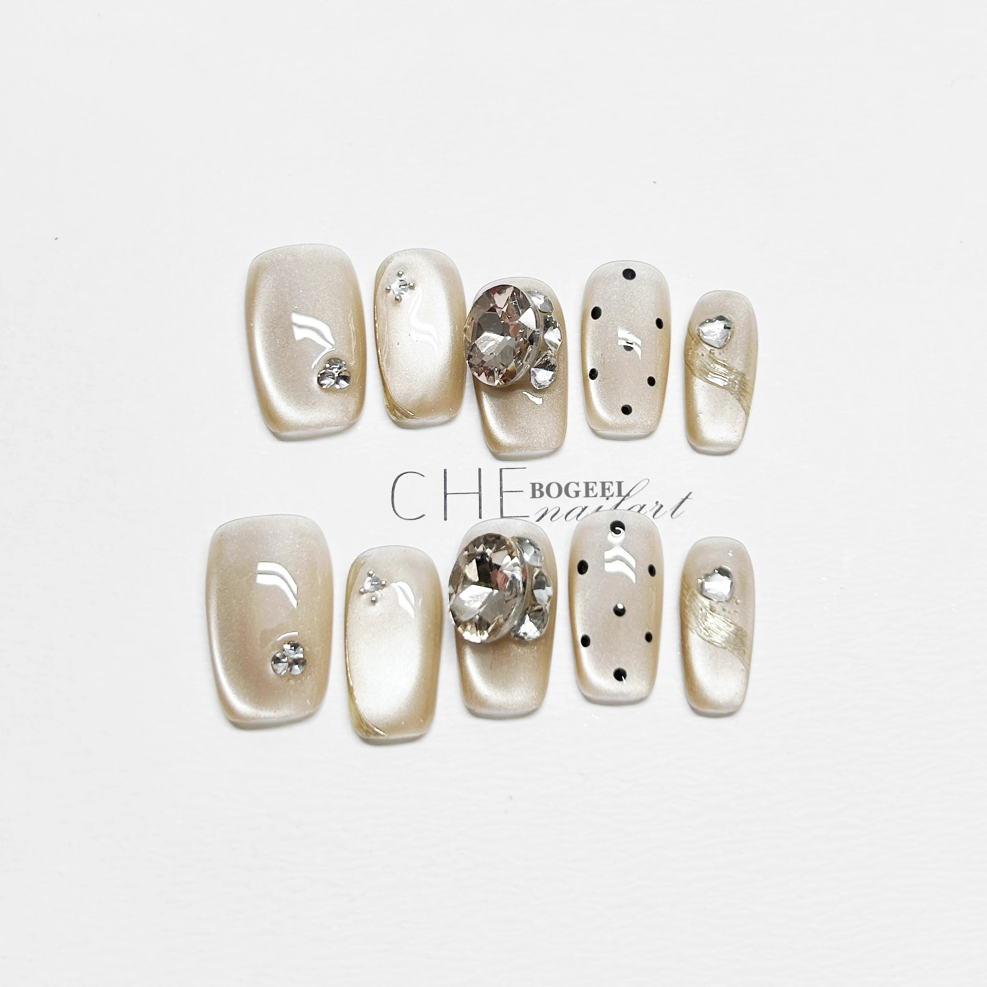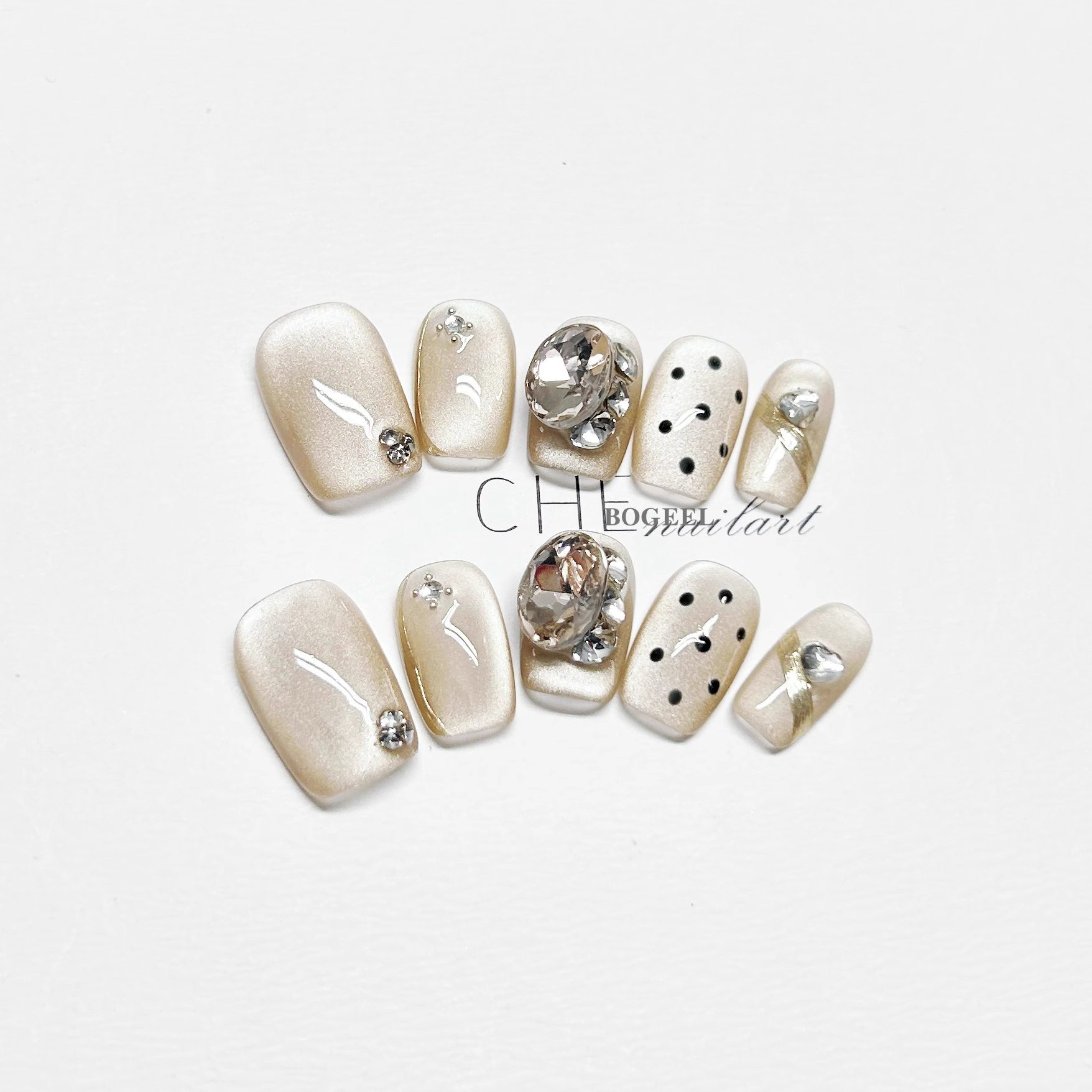 【凯丽】波点猫眼波点闪钻法式爱心纯手工穿戴甲短款高质量美甲