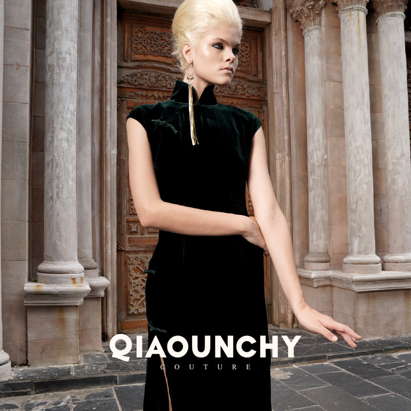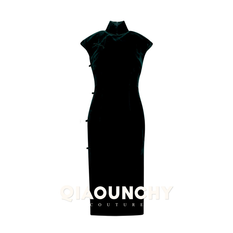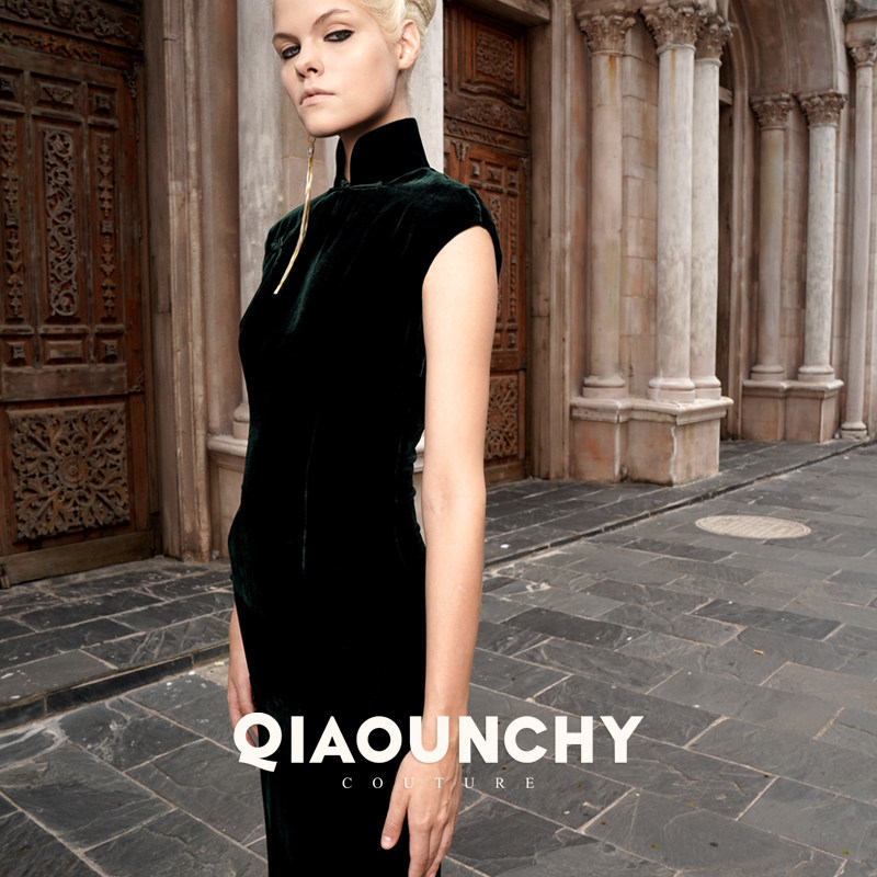 法式立裁 QIAOUNCHY俏云曦 | 帝王绿真丝丝绒经典修身旗袍裙新品