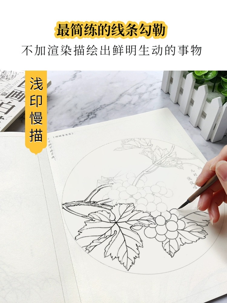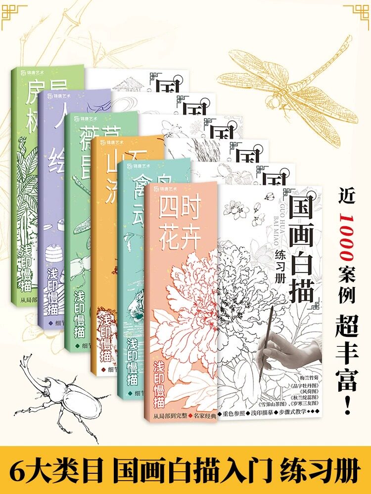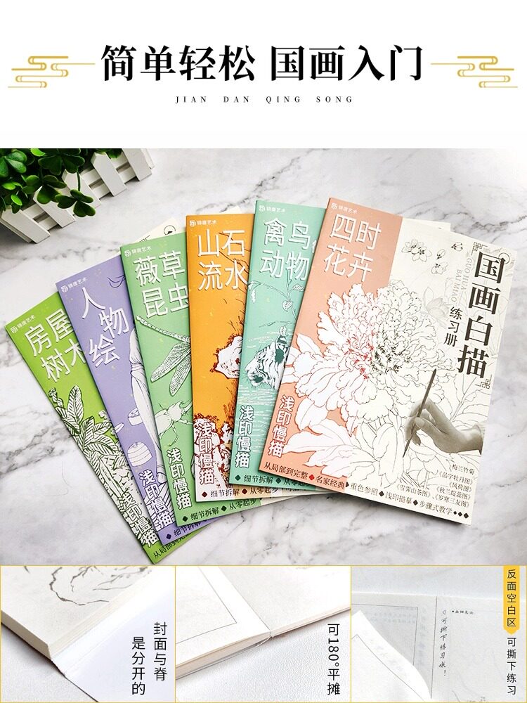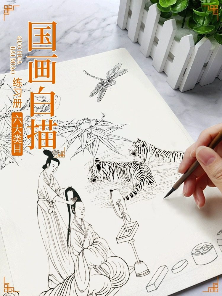国画白描练习册6本 勾线控笔工笔画描摹本人物山水花鸟动物房屋昆虫成人儿童学生初学者画画自学零基础入门临摹画册 线稿底稿画册