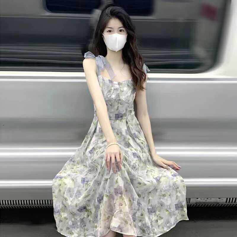 吊带连衣裙油画风法式茶歇碎花女夏季氛围感森系仙女裙雪纺长裙子