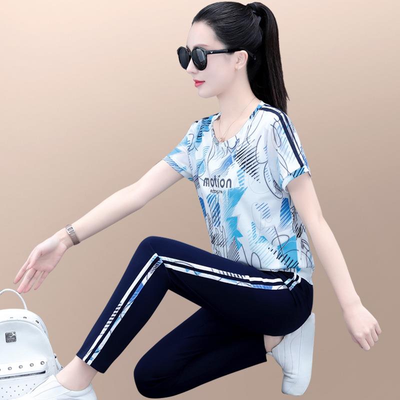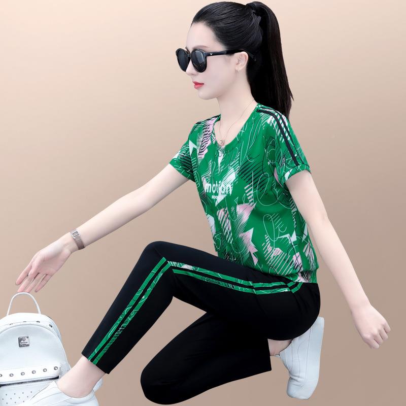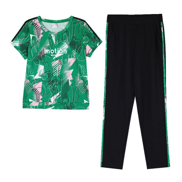 运动套装70700002女夏新款短洋气减显瘦龄女裤士花色袖长休闲服两