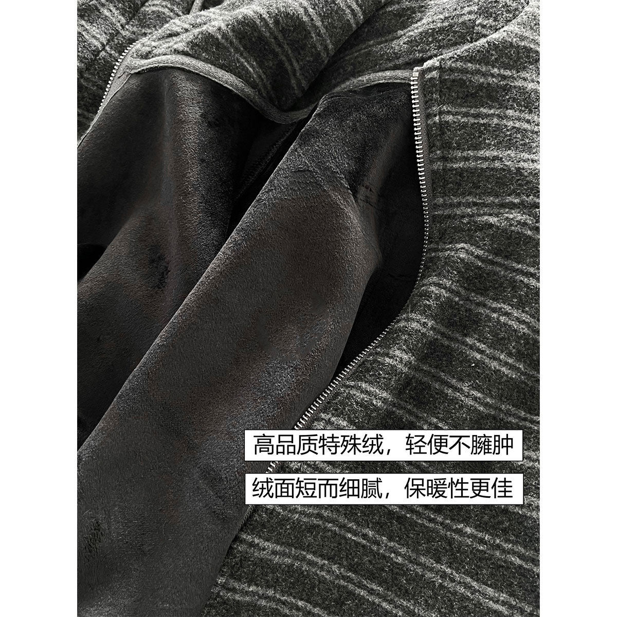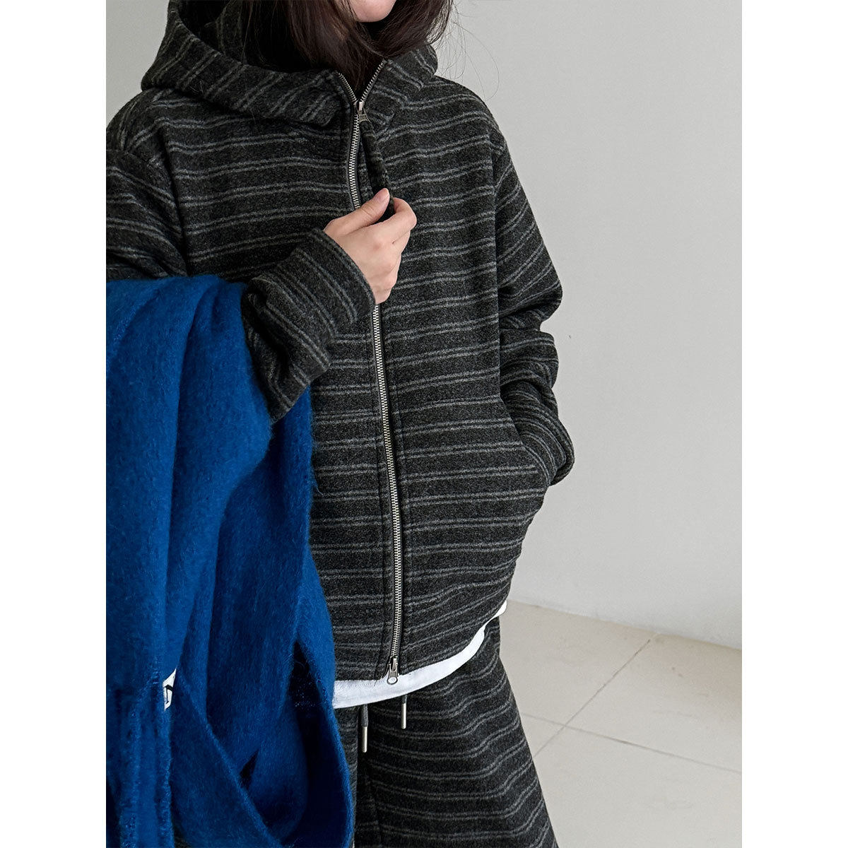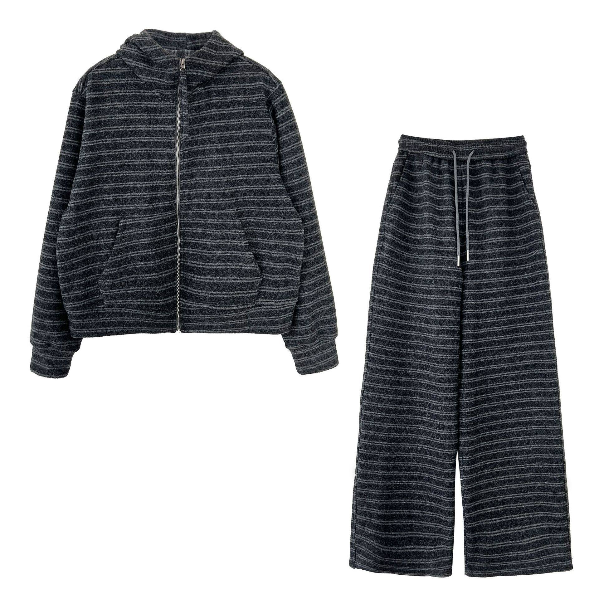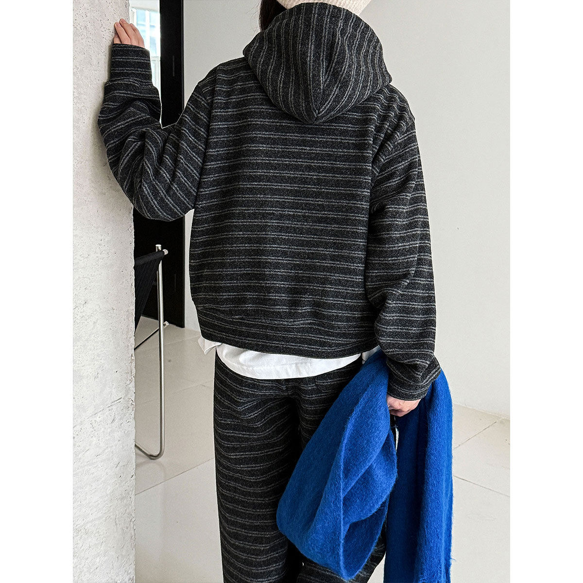 鹿西 复古条纹拉链连帽加绒开衫上衣+阔腿裤两件套装女冬新款2151