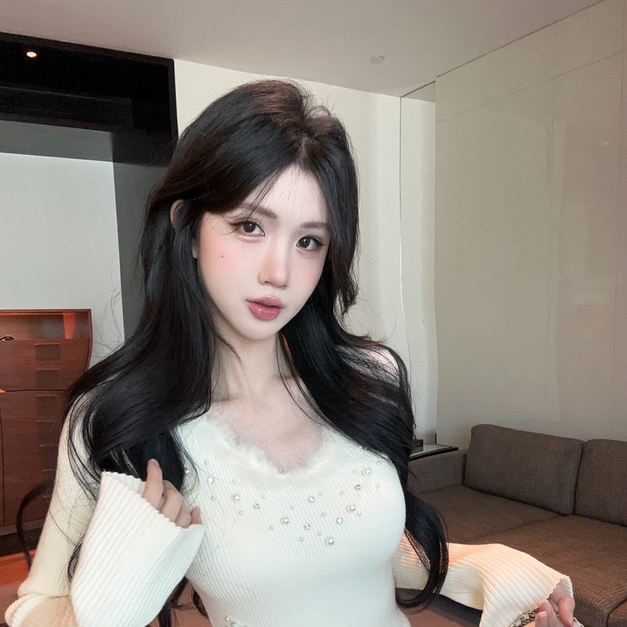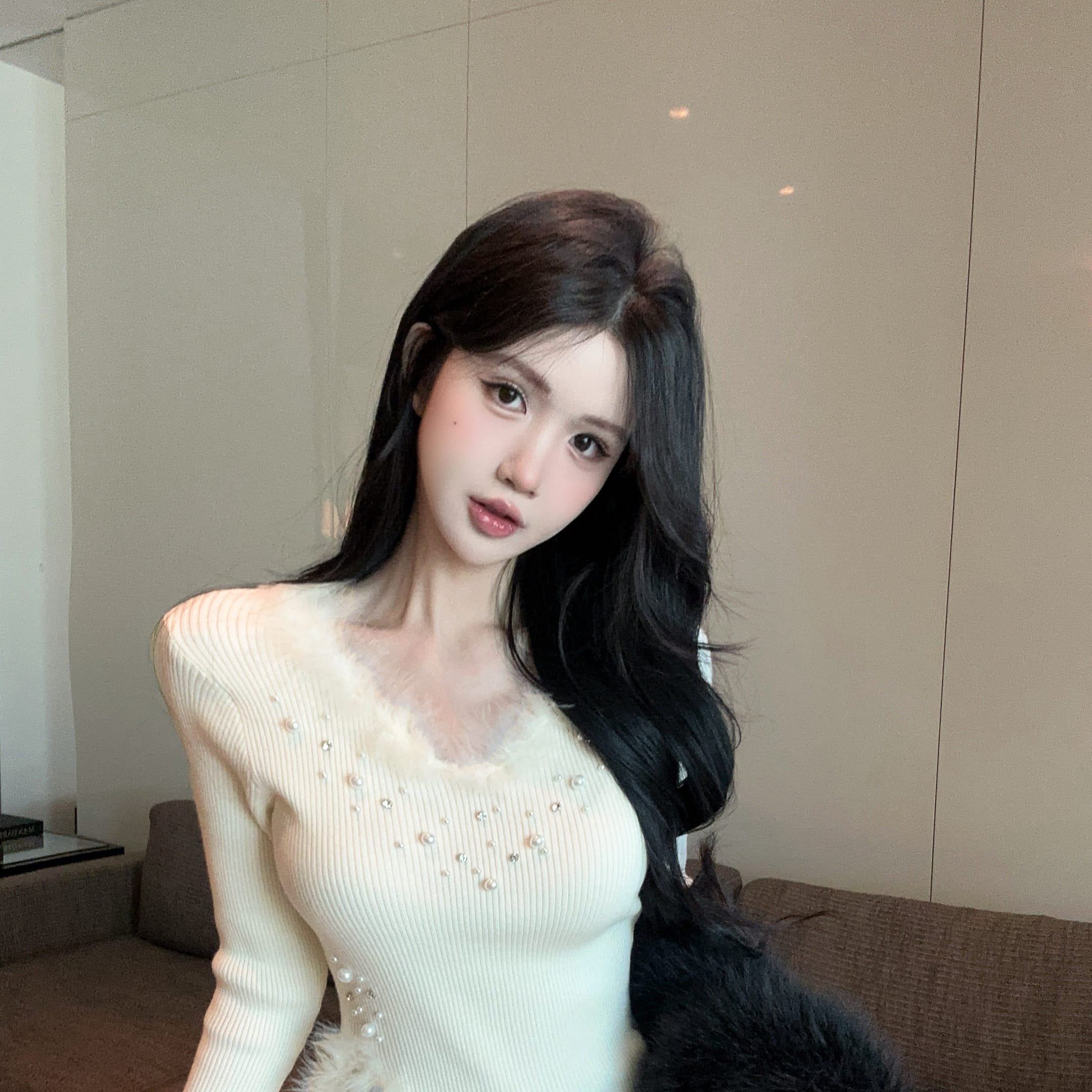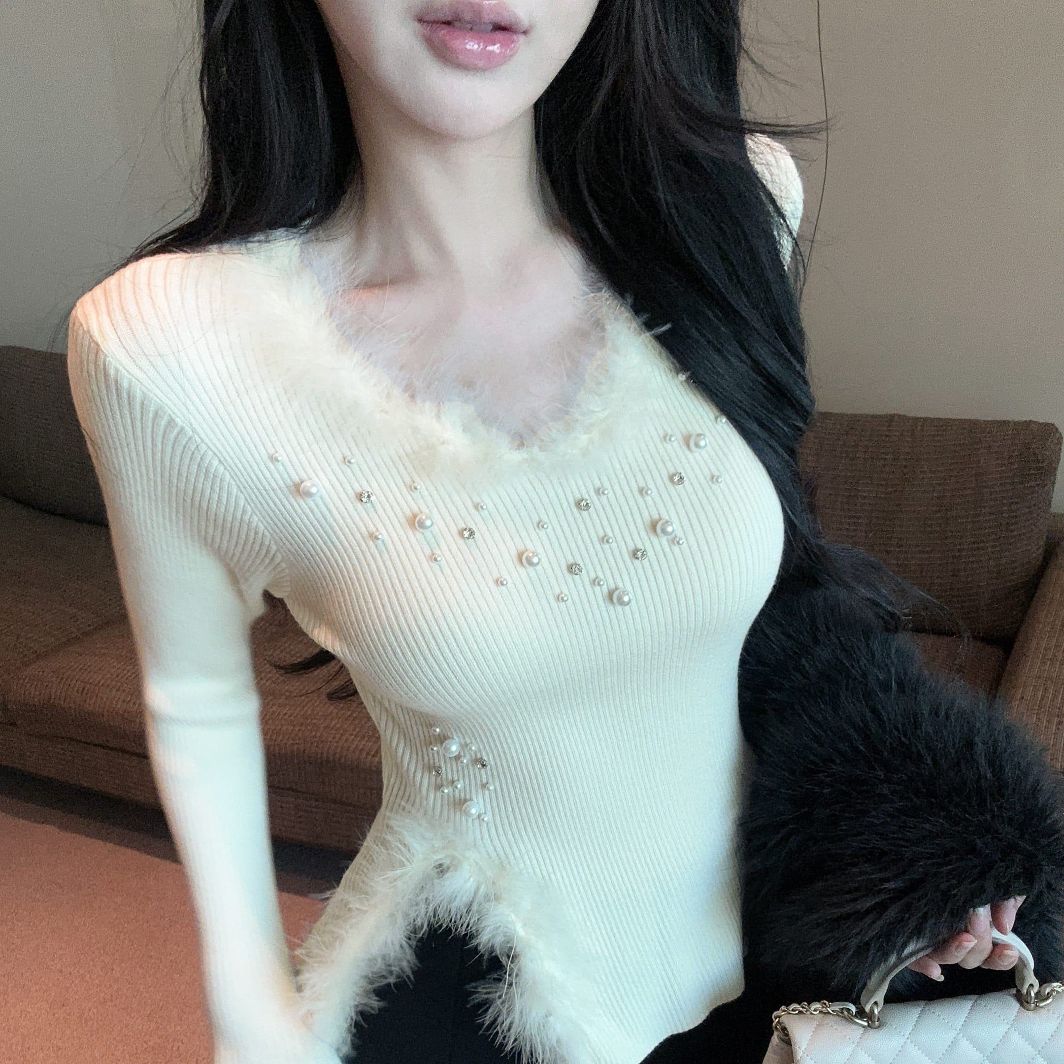 毛绒拼接V领开叉针织衫女重工钉珠打底毛衣上衣