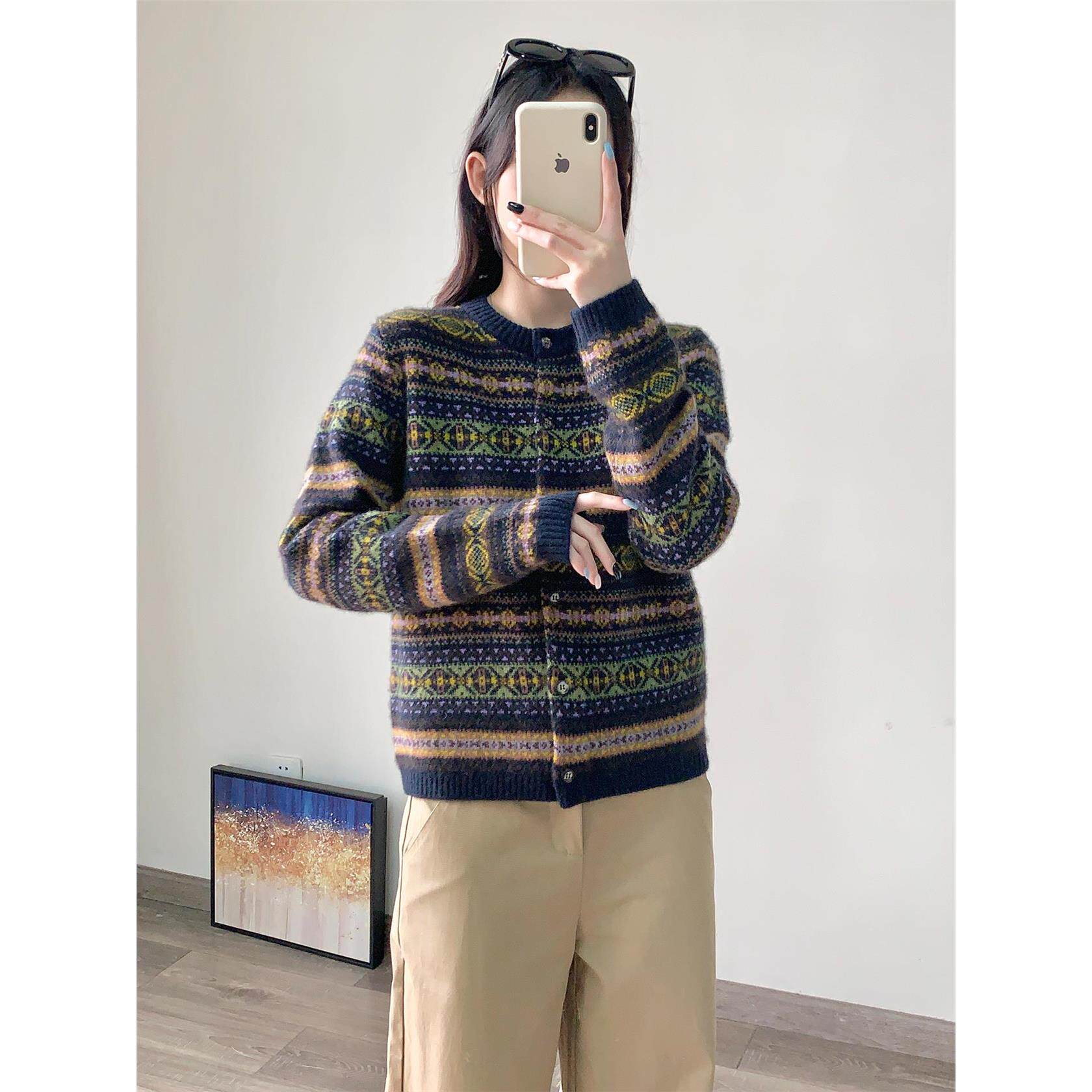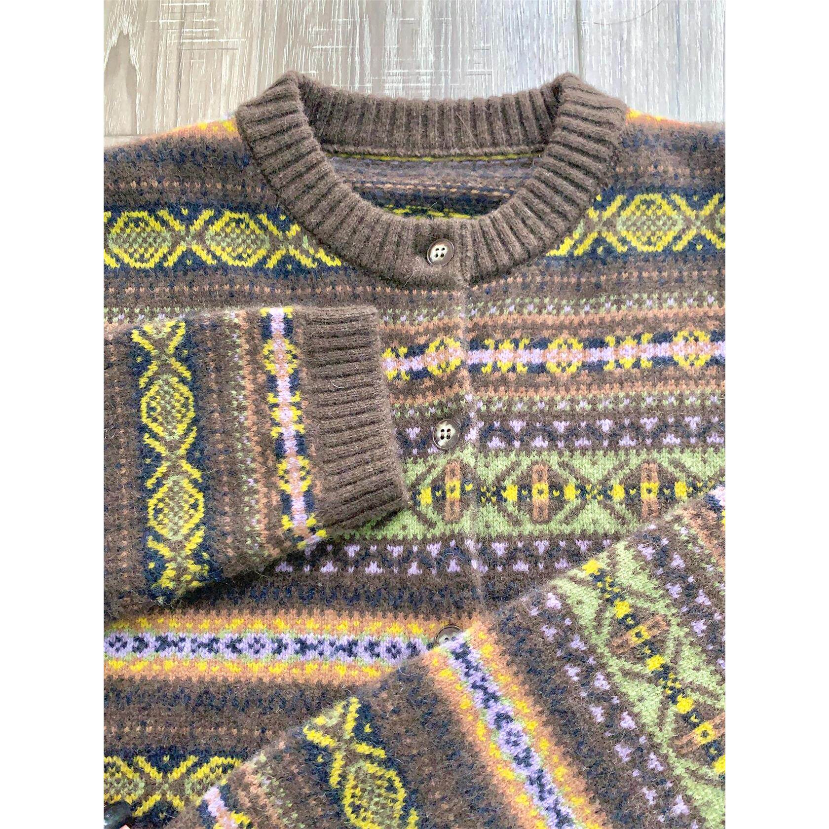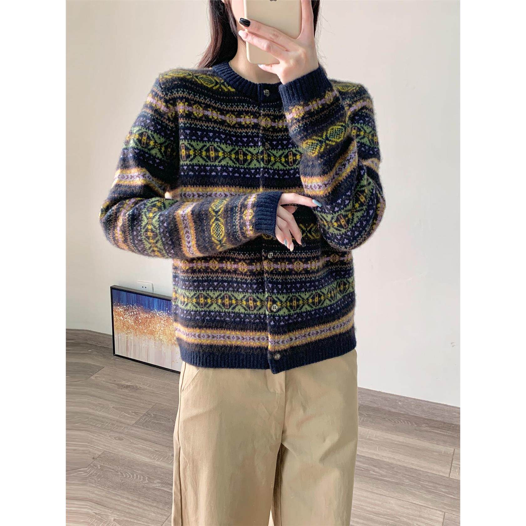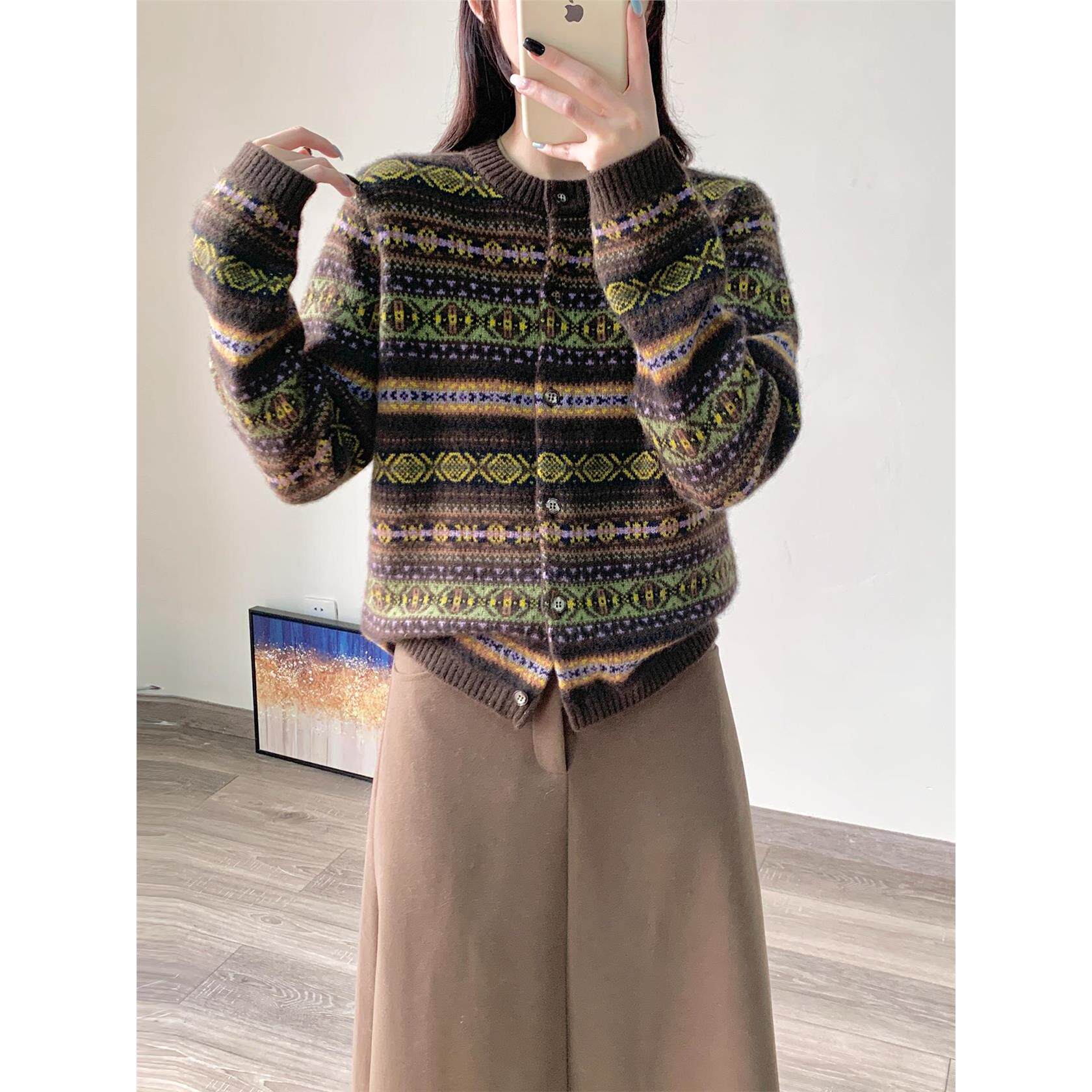 毛衣外套女2025新款秋冬费尔岛提花纯牦牛绒长袖圆领针织开衫上衣