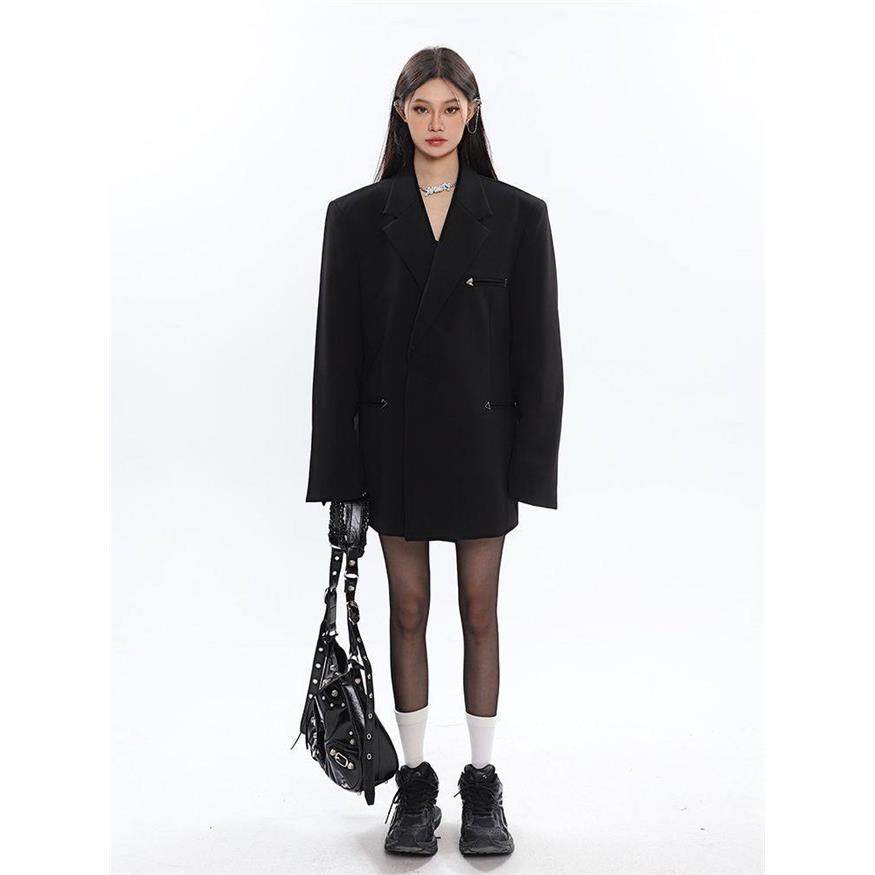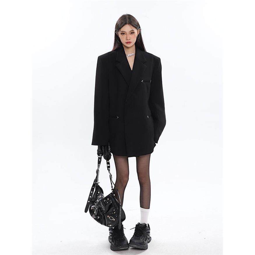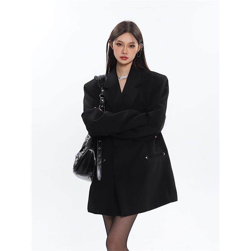 陈不哭 黑色高级设计感垫肩西服金属装饰宽松西装外套女春秋