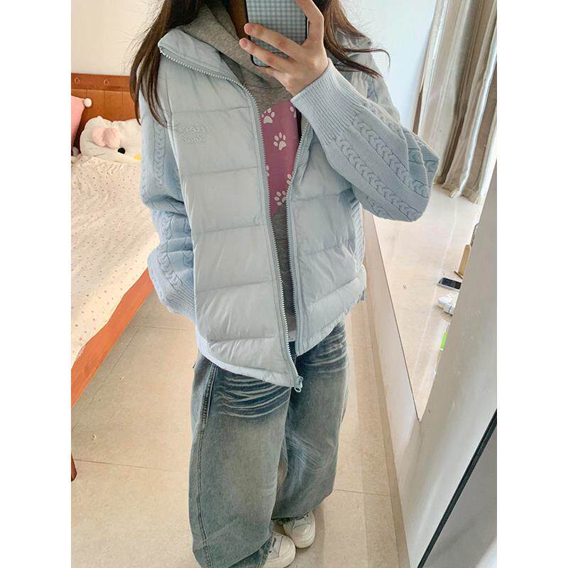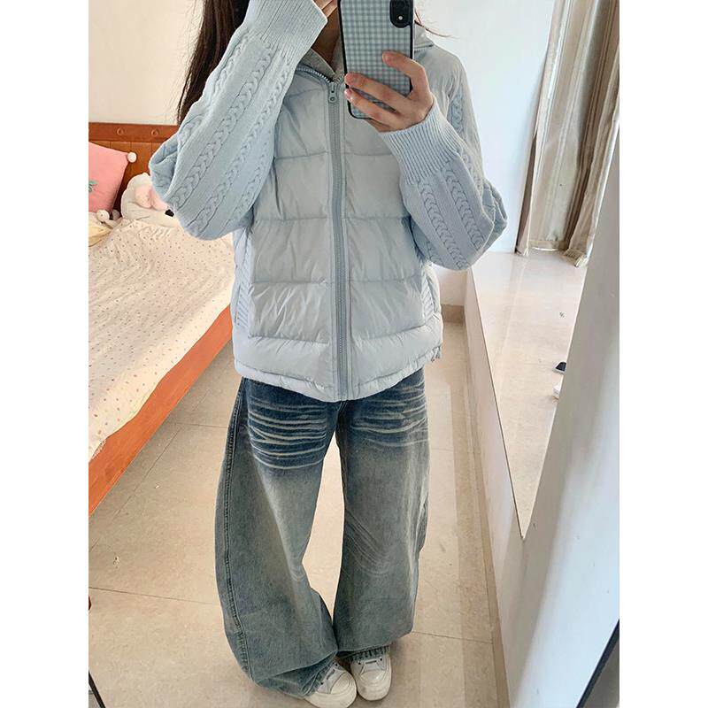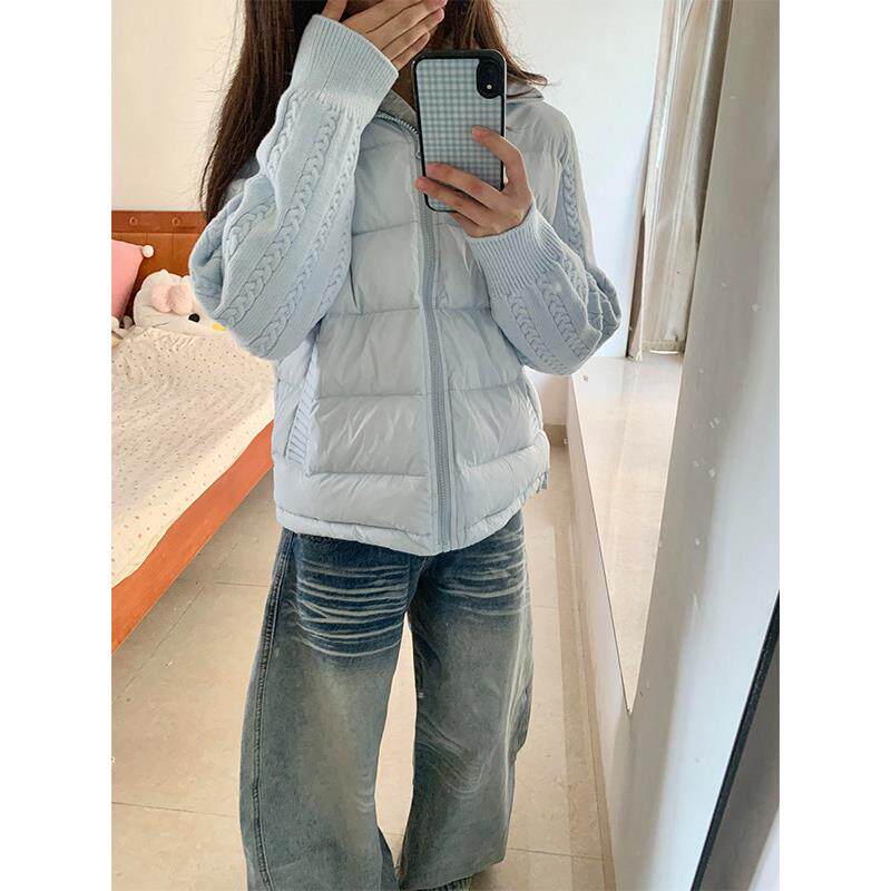 蓝色针织拼接羽绒棉服女秋冬2025新款设计感加厚保暖小个子短外套