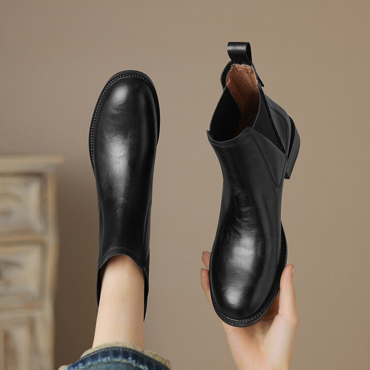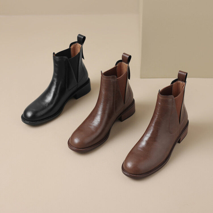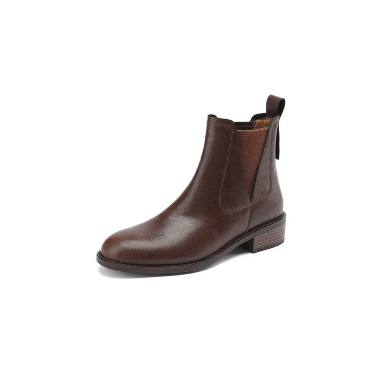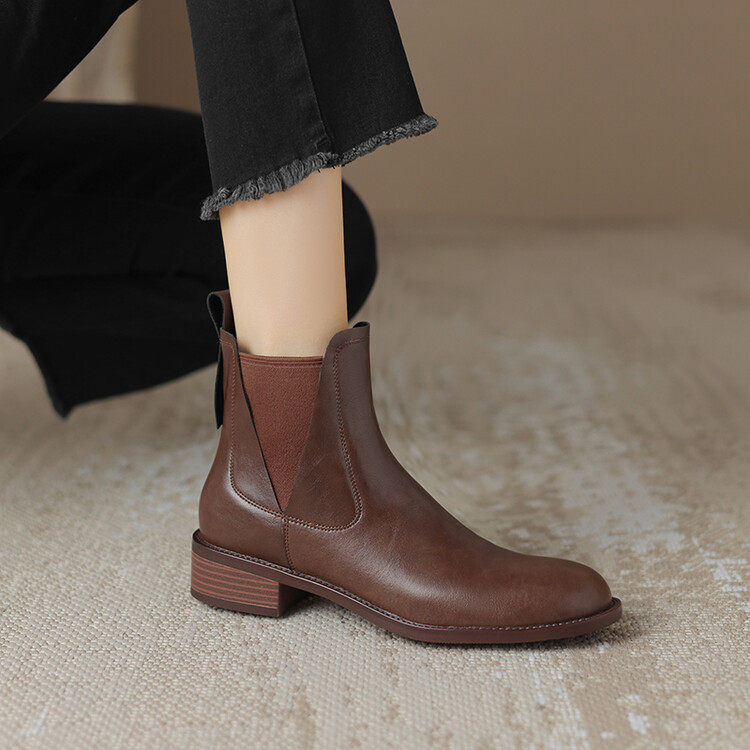 复古方头切尔西短靴女棕色松紧口牛皮中跟粗跟短筒马丁靴大码裸靴