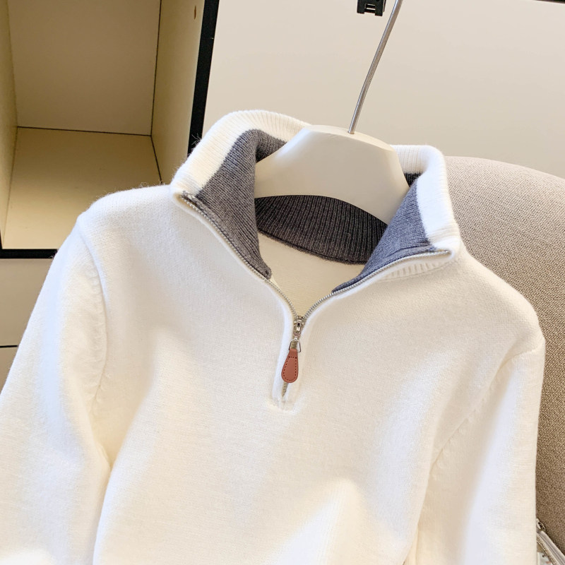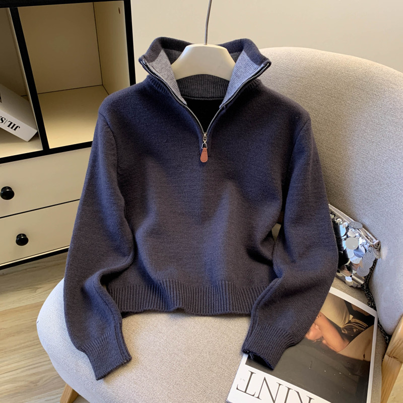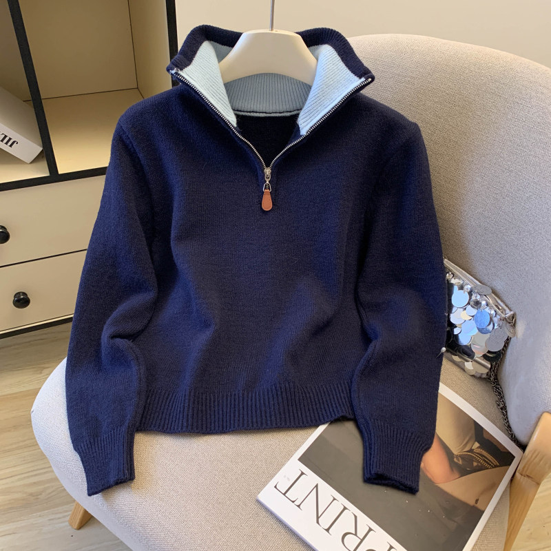 实拍 韩系设计感撞色领polo拉链针织毛衣女上衣