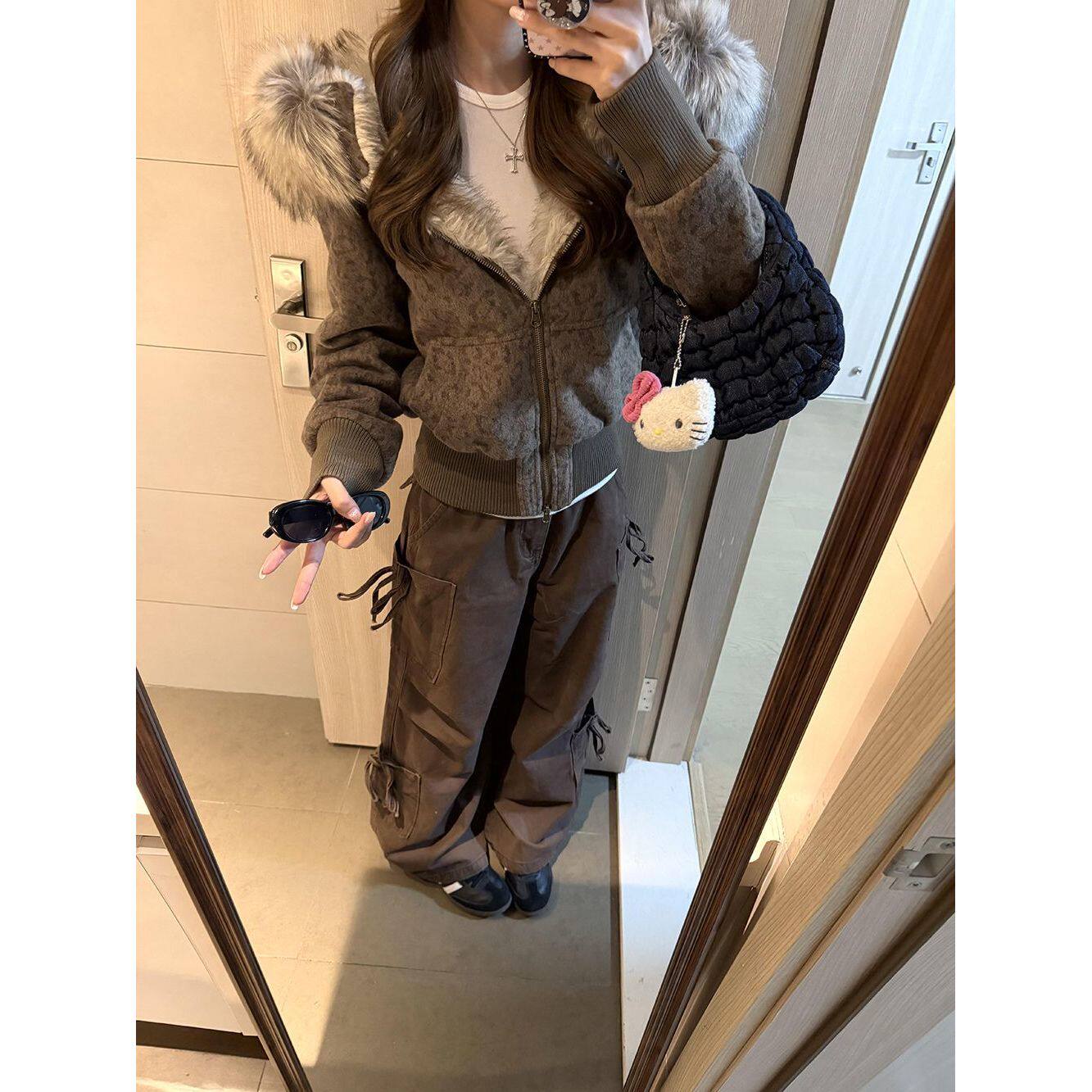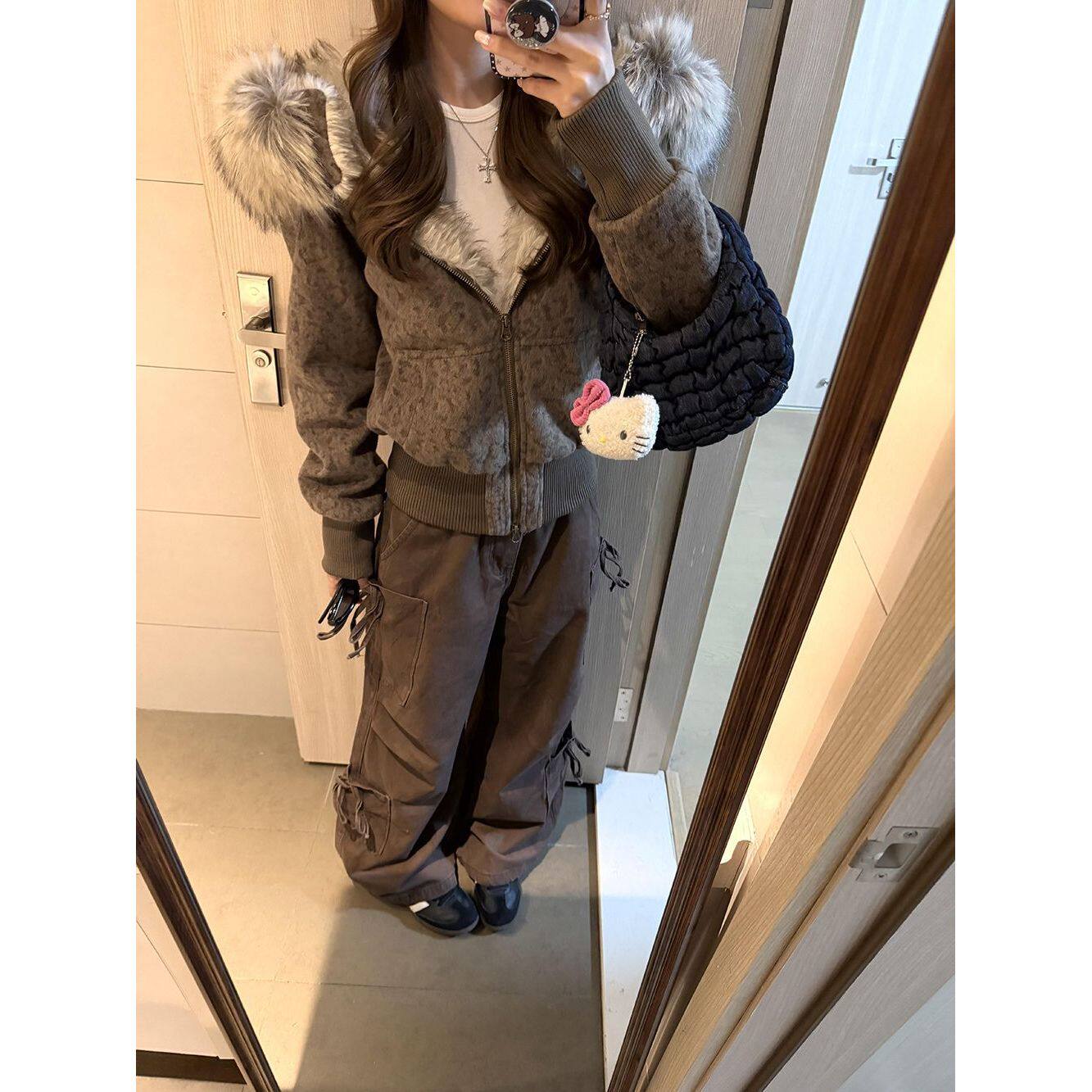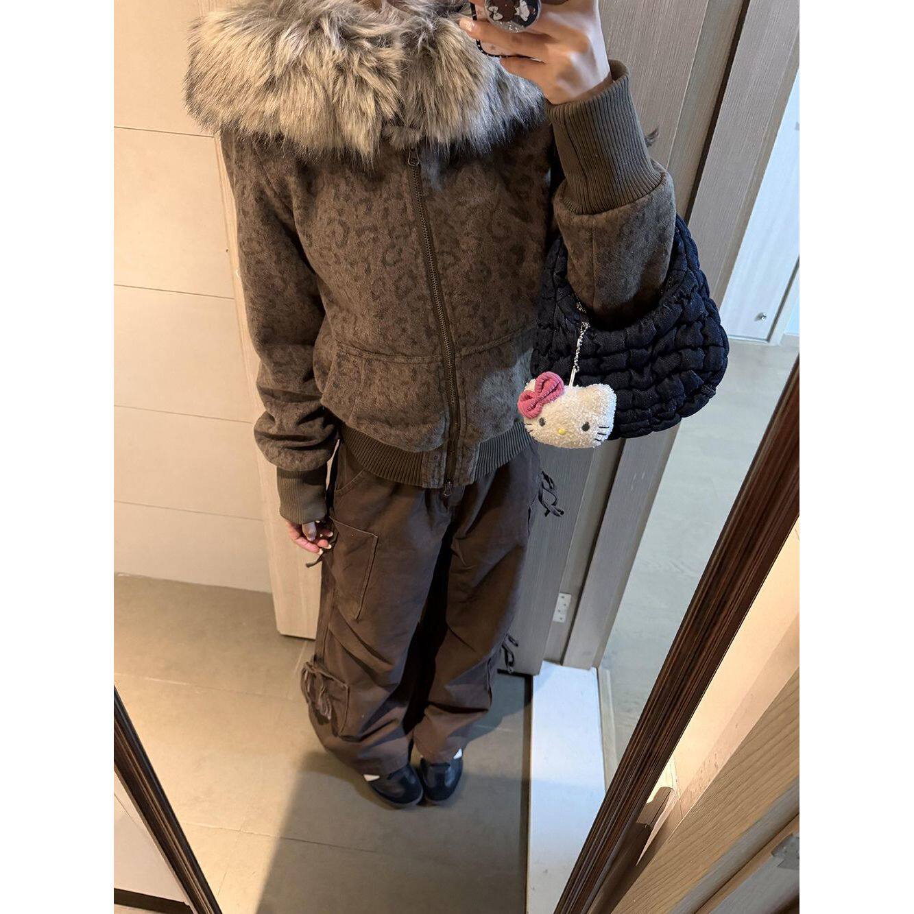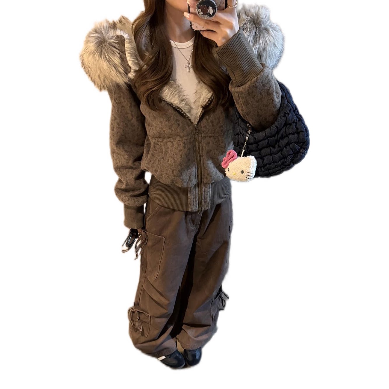 韩系复古豹纹毛领连帽外套女冬季新款小众设计感高级修身休闲外套