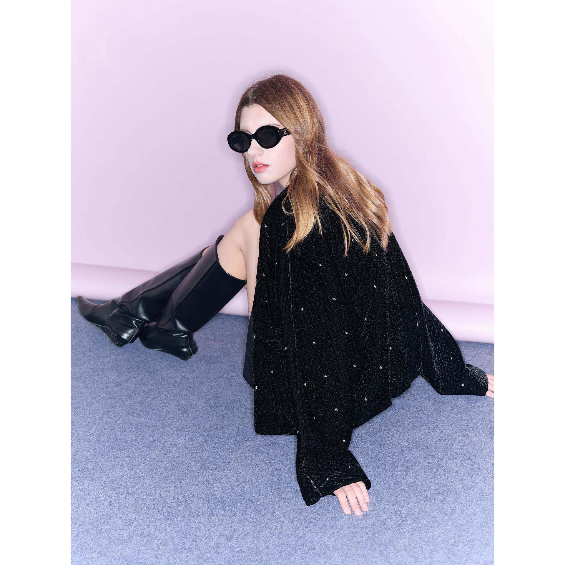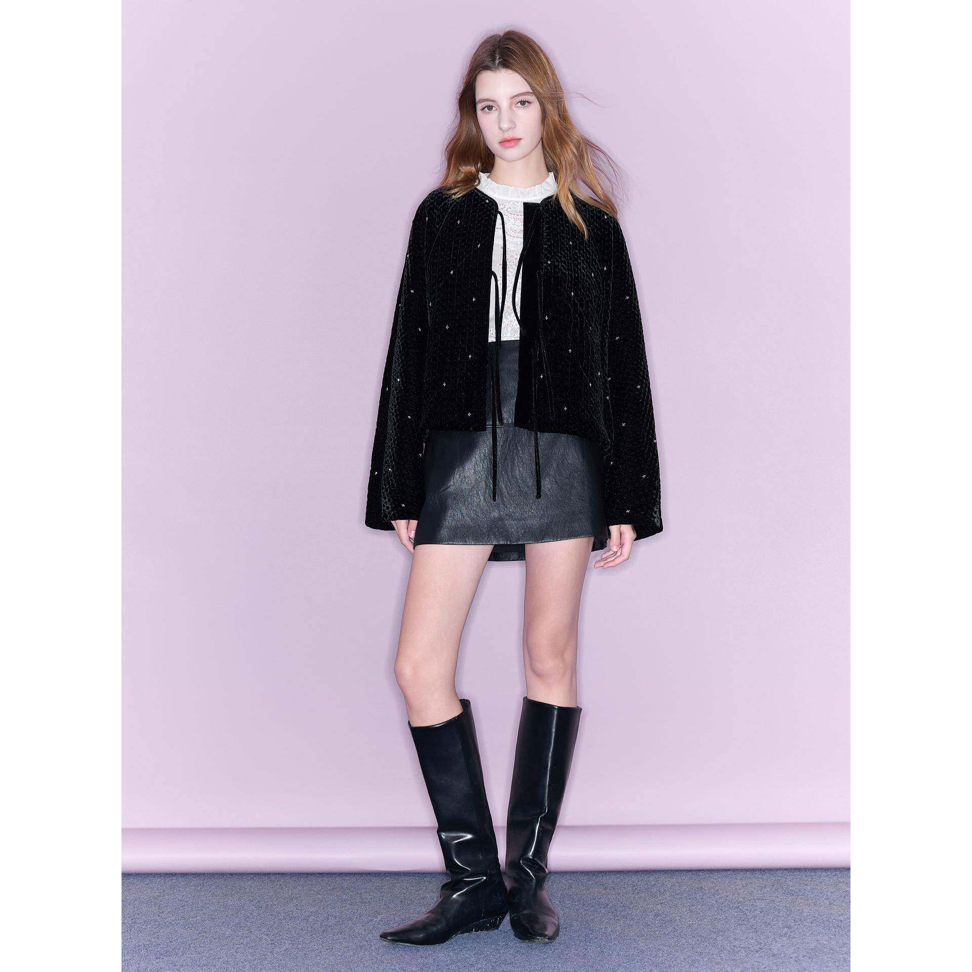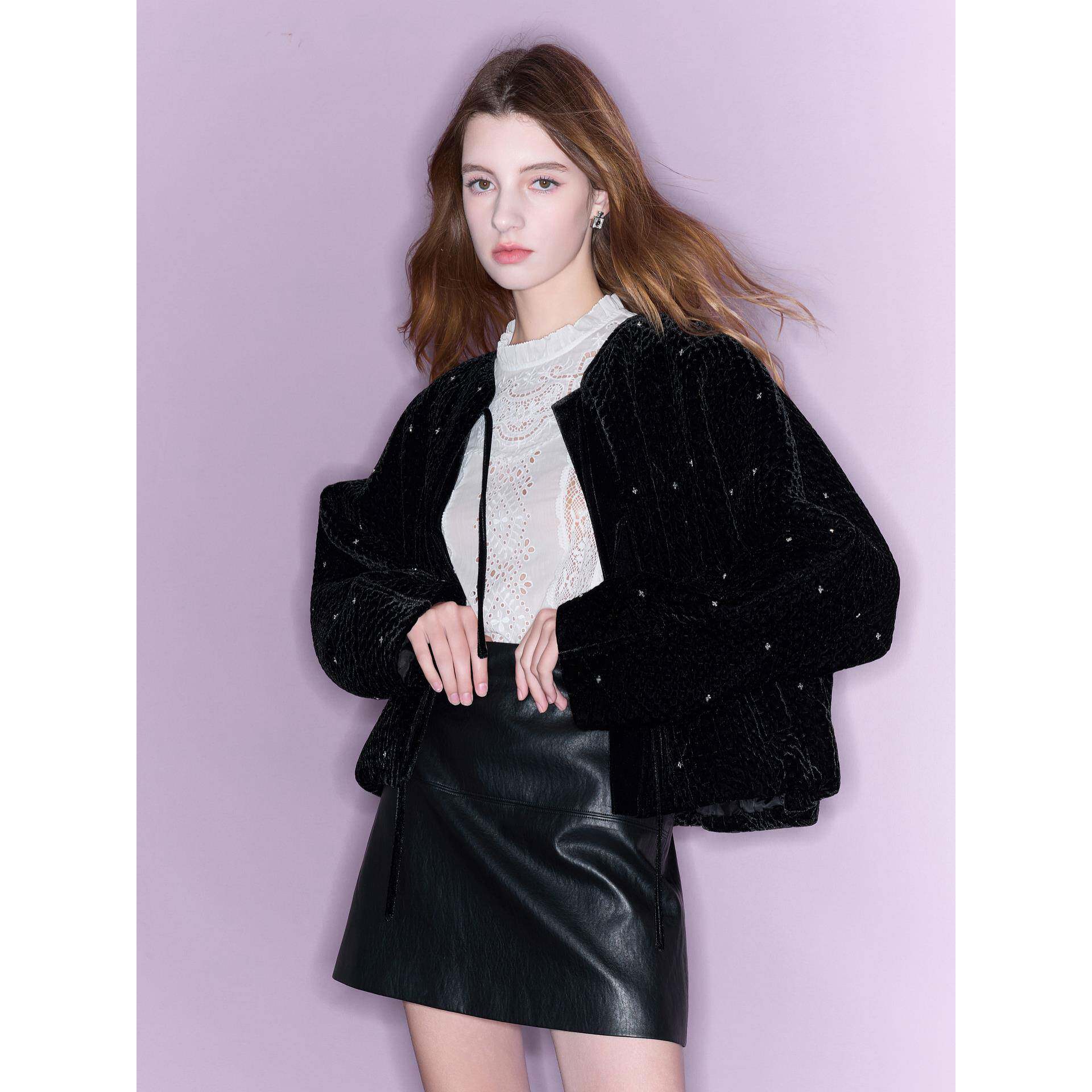 ibudu2025冬季新款黑色短款棉服外套圆领系带棉衣宽松休闲女