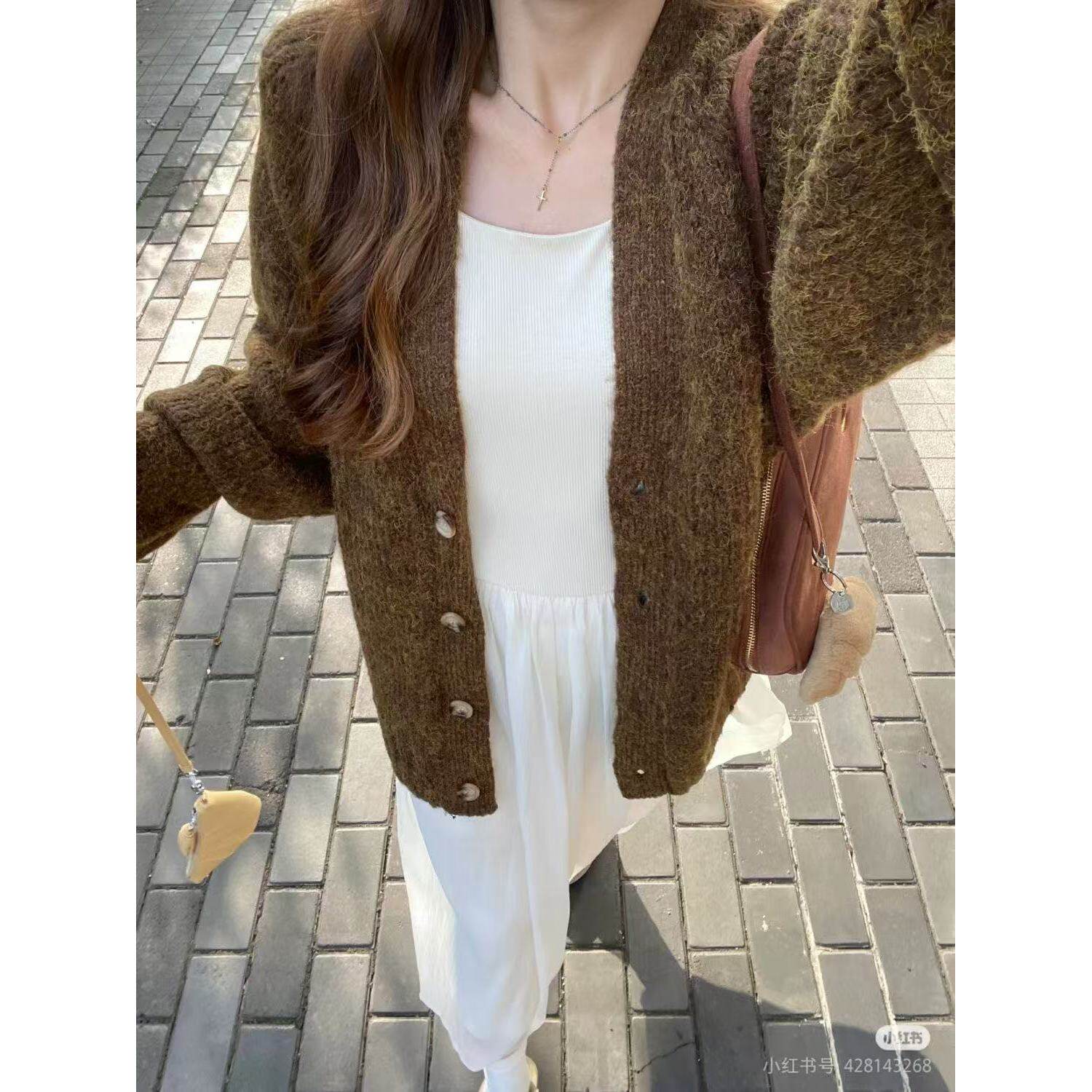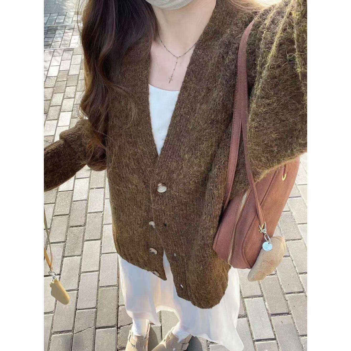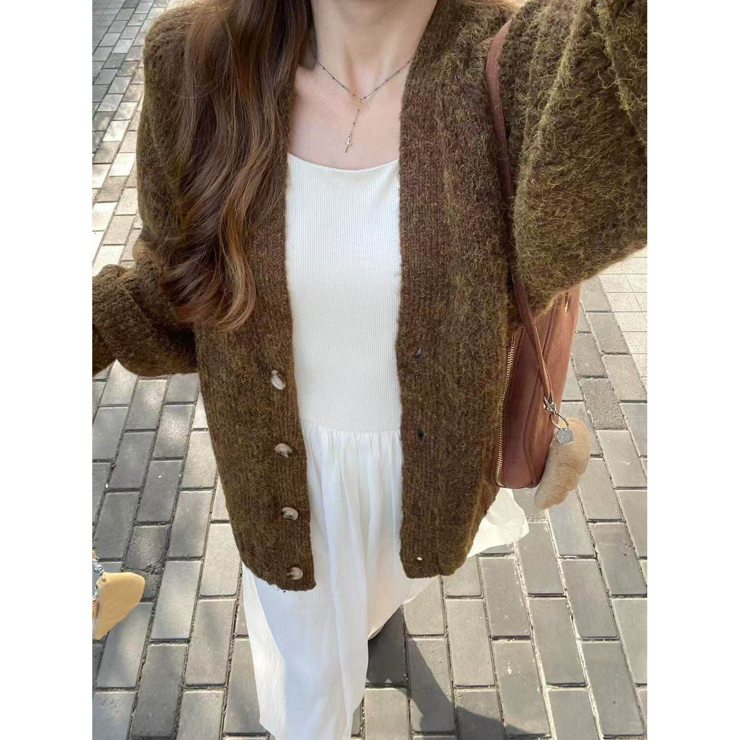 复古咖色毛衣开衫针织外套秋季宽松慵懒风软拉德针织衫正肩上衣