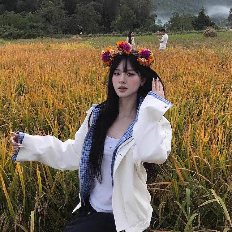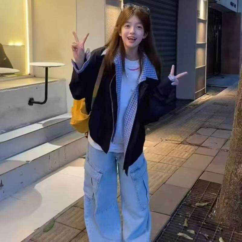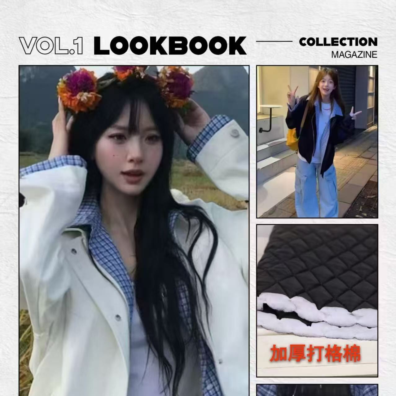 格子撞色翻领刺绣假两件夹克棉衣外套女冬季宽松休闲设计感上衣