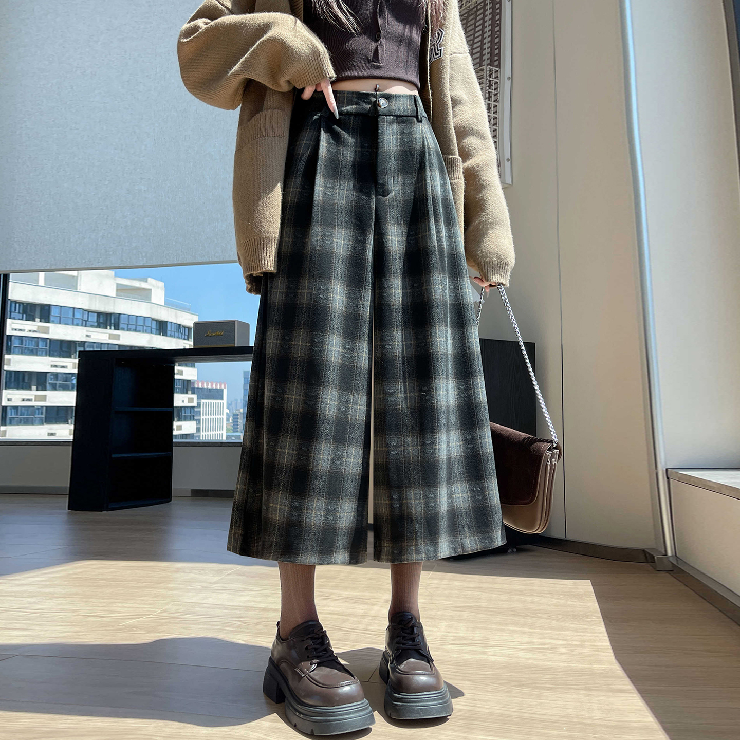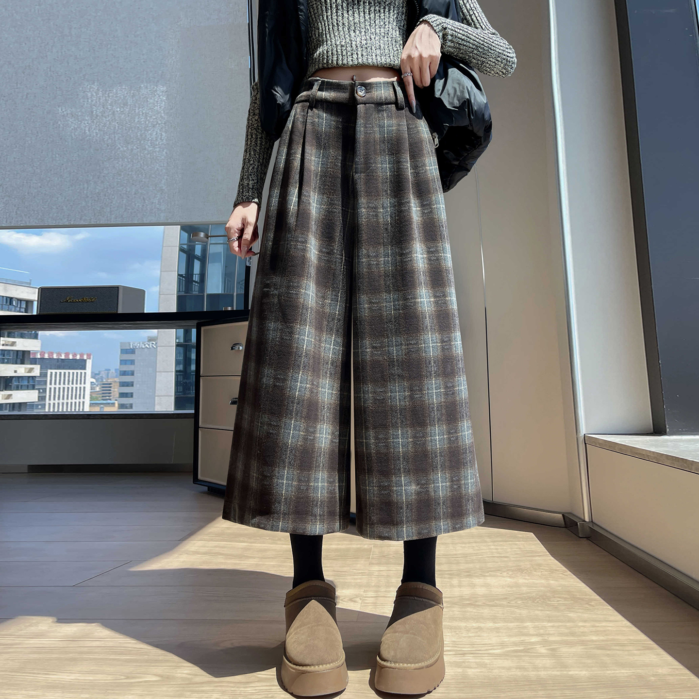 实拍加绒毛呢格子阔腿裤女2025秋冬小个子显瘦外穿休闲直筒七分裤