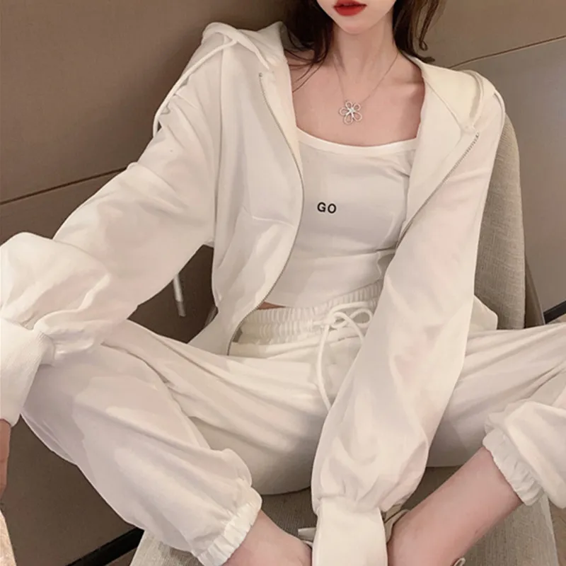 2025港风休闲运动套装女时尚短款吊带连帽卫衣束脚裤三件套装