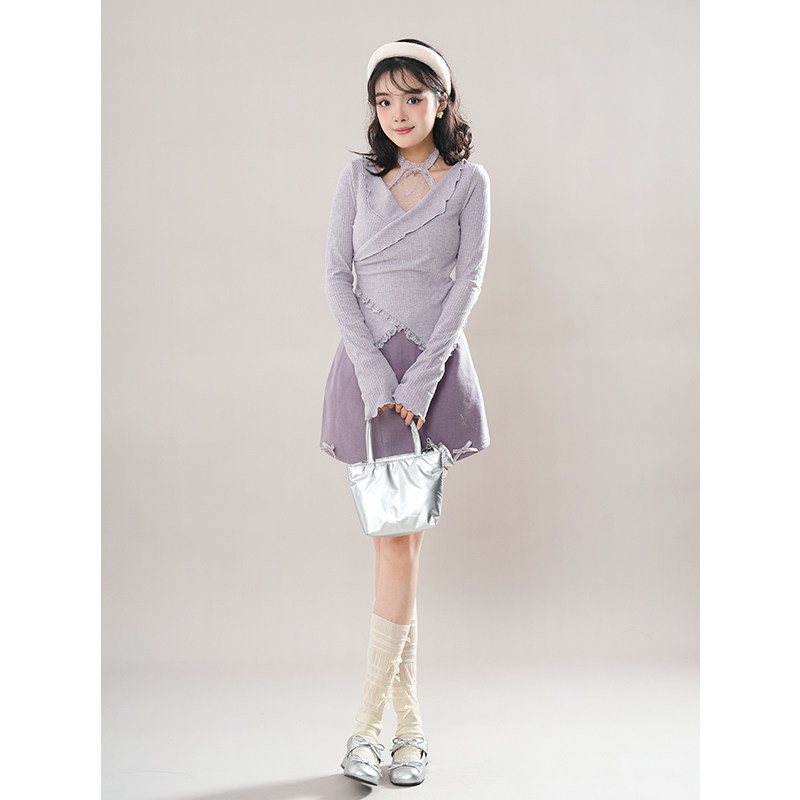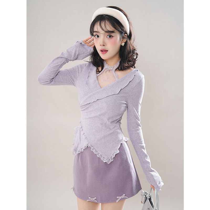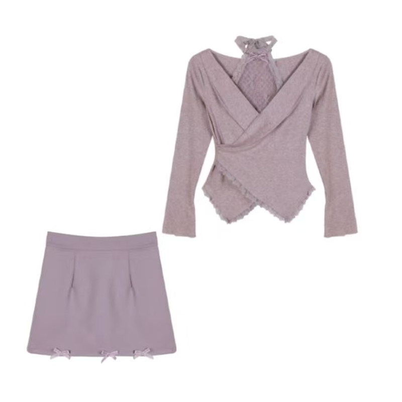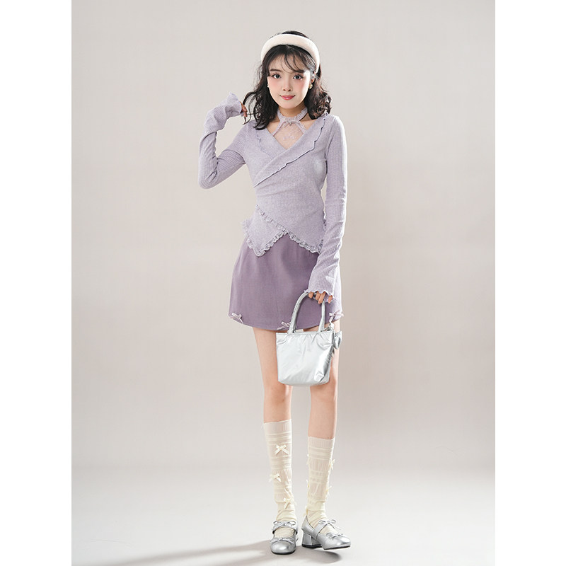 紫雾星河 2025春新款纯欲风显瘦上衣短裙套装甜美花边雾紫两件套