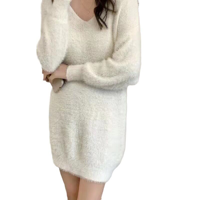 V领中长款仿水貂绒显瘦毛衣女遮屁春秋慵懒风宽松长袖软糯针织衫