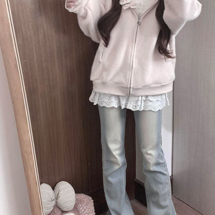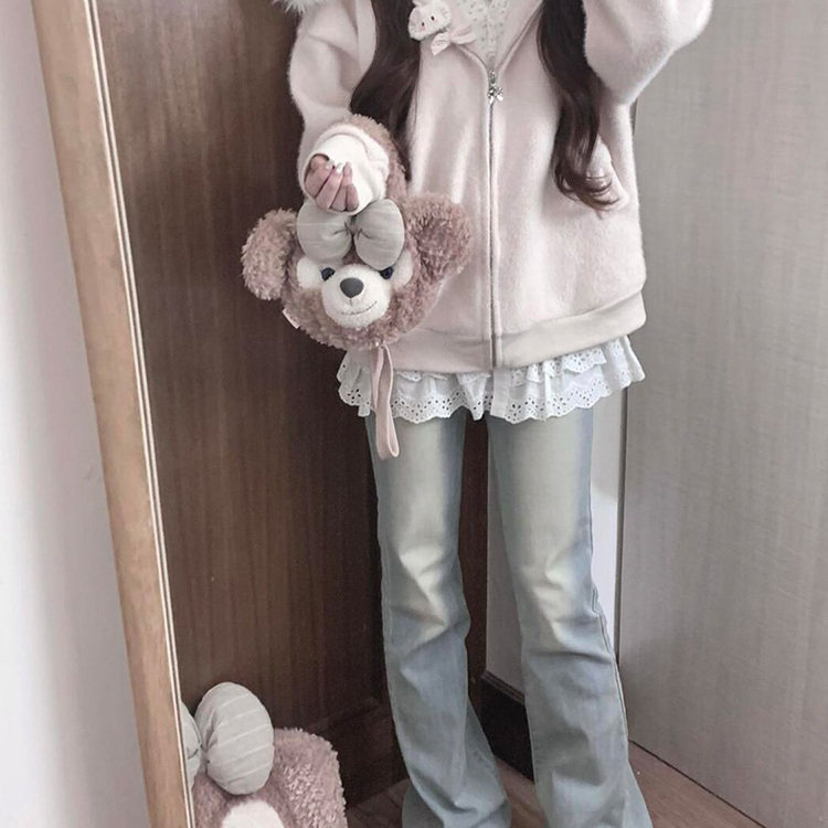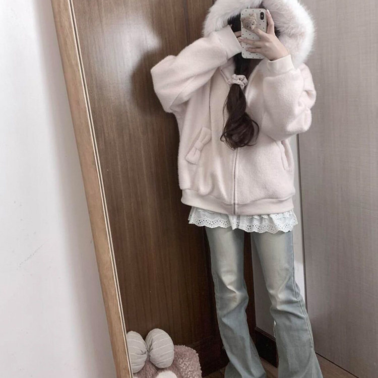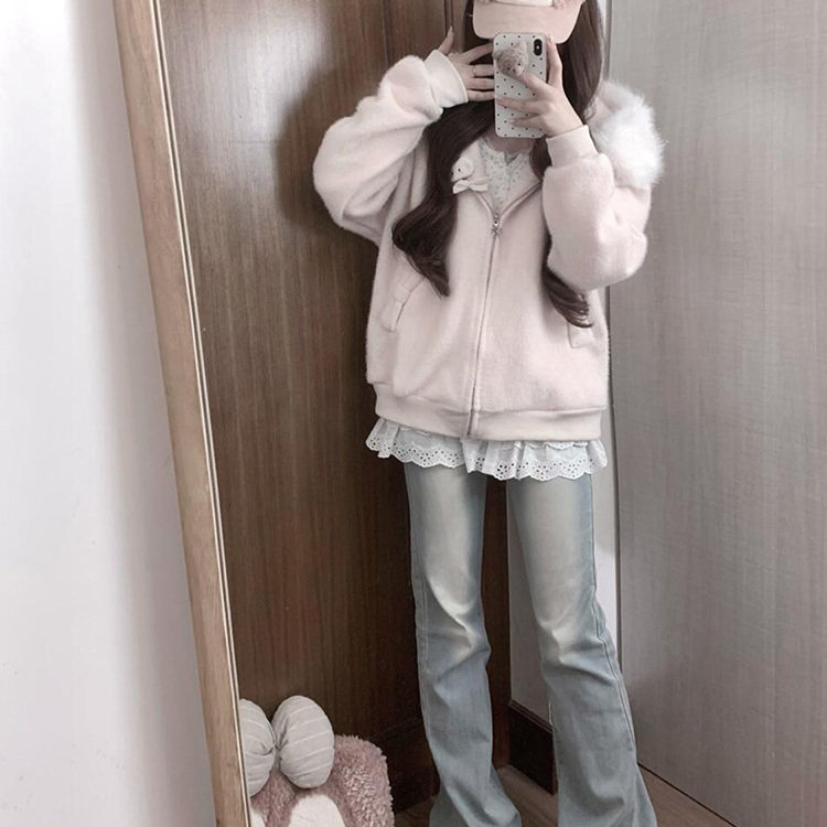 韩系甜美粉色毛领连帽针织开衫毛衣女秋冬小个子慵懒宽松显瘦外套