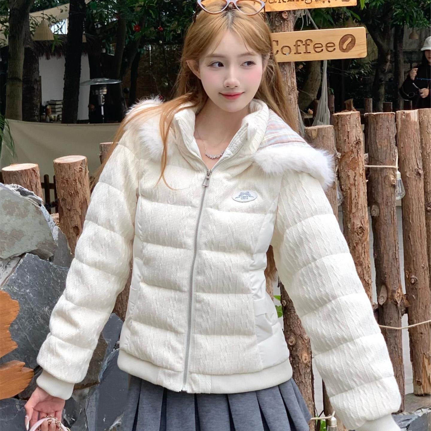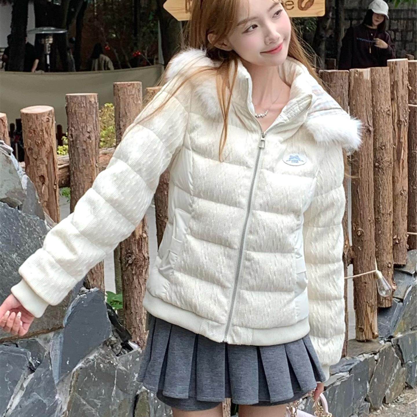 韩系甜美收腰羽绒棉服女2025新款冬季小个子毛织拼接毛领连帽外套