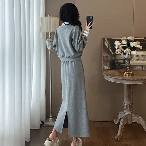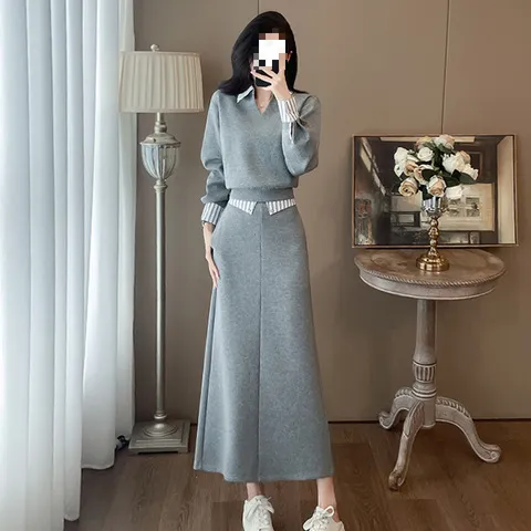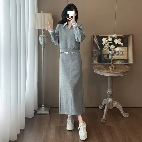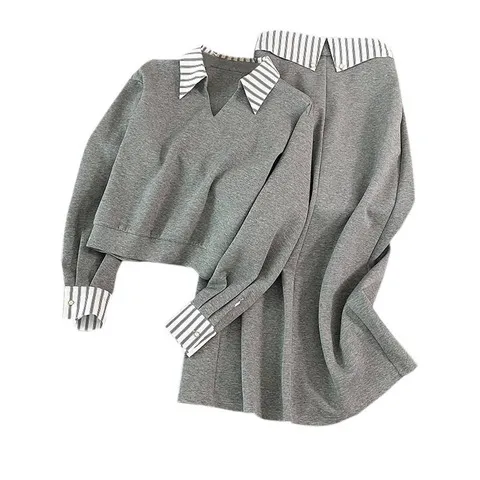 灰色通勤风半身裙上衣秋季假两件两件套时尚韩版套装2025女装气质