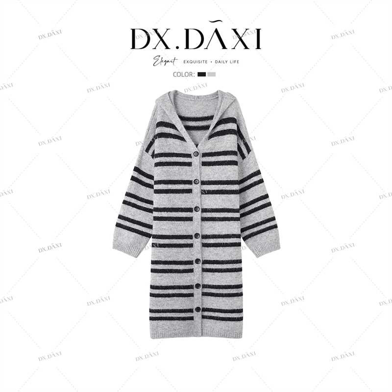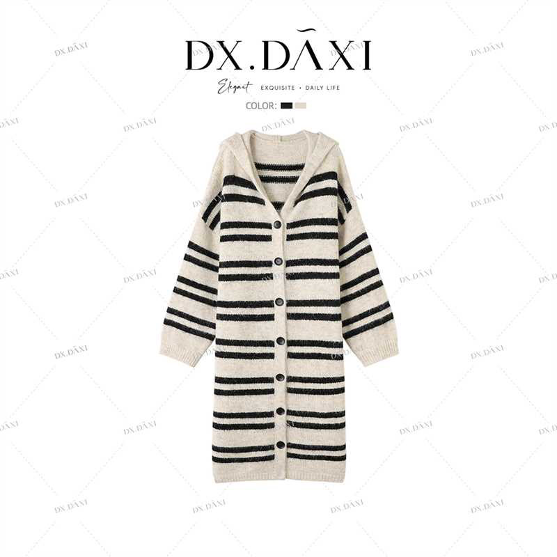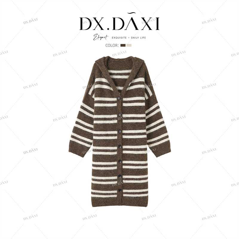 DX.DAXI【拿铁奥利奥】长款条纹连帽针织上衣宽松慵懒外穿2025